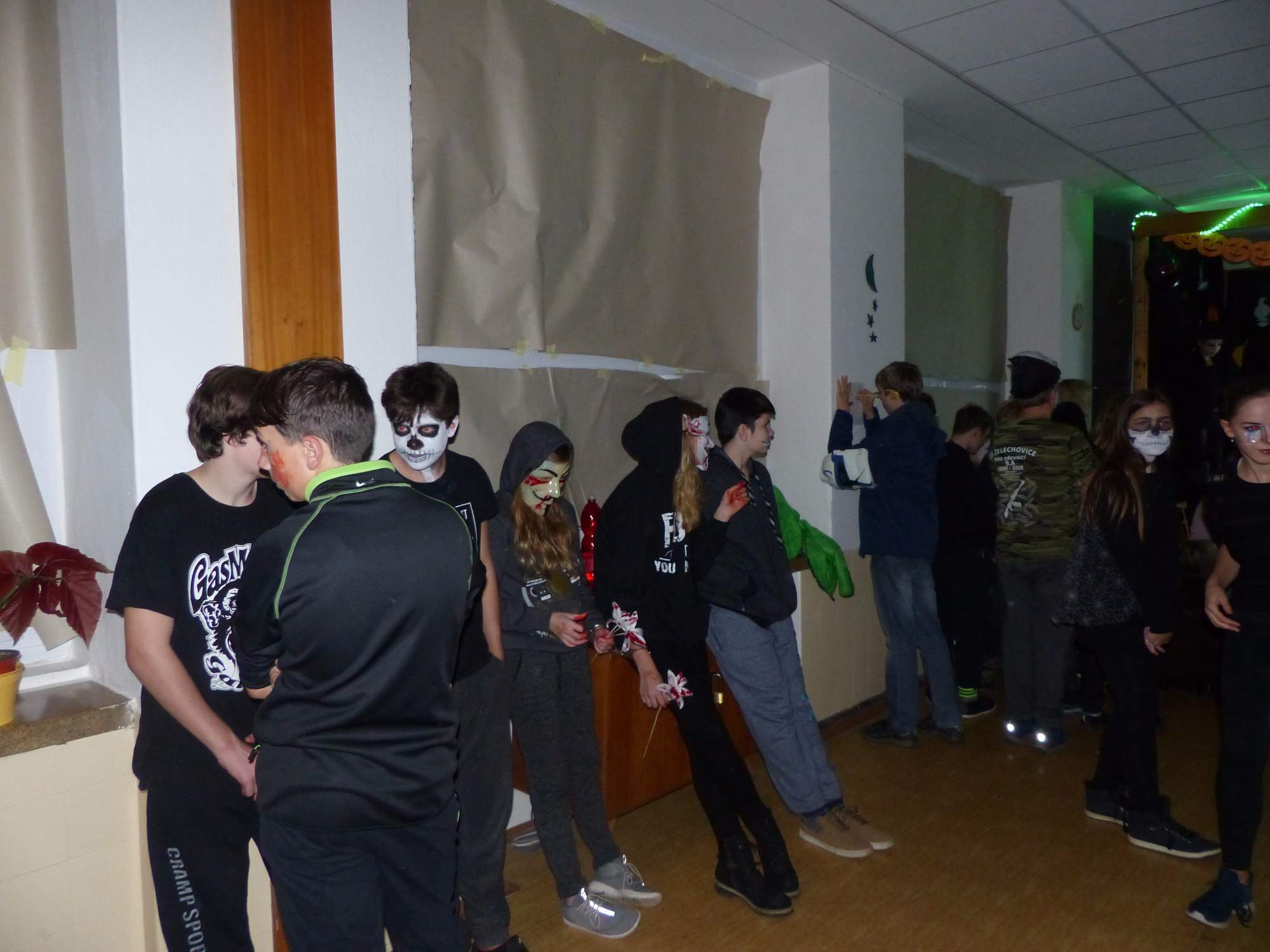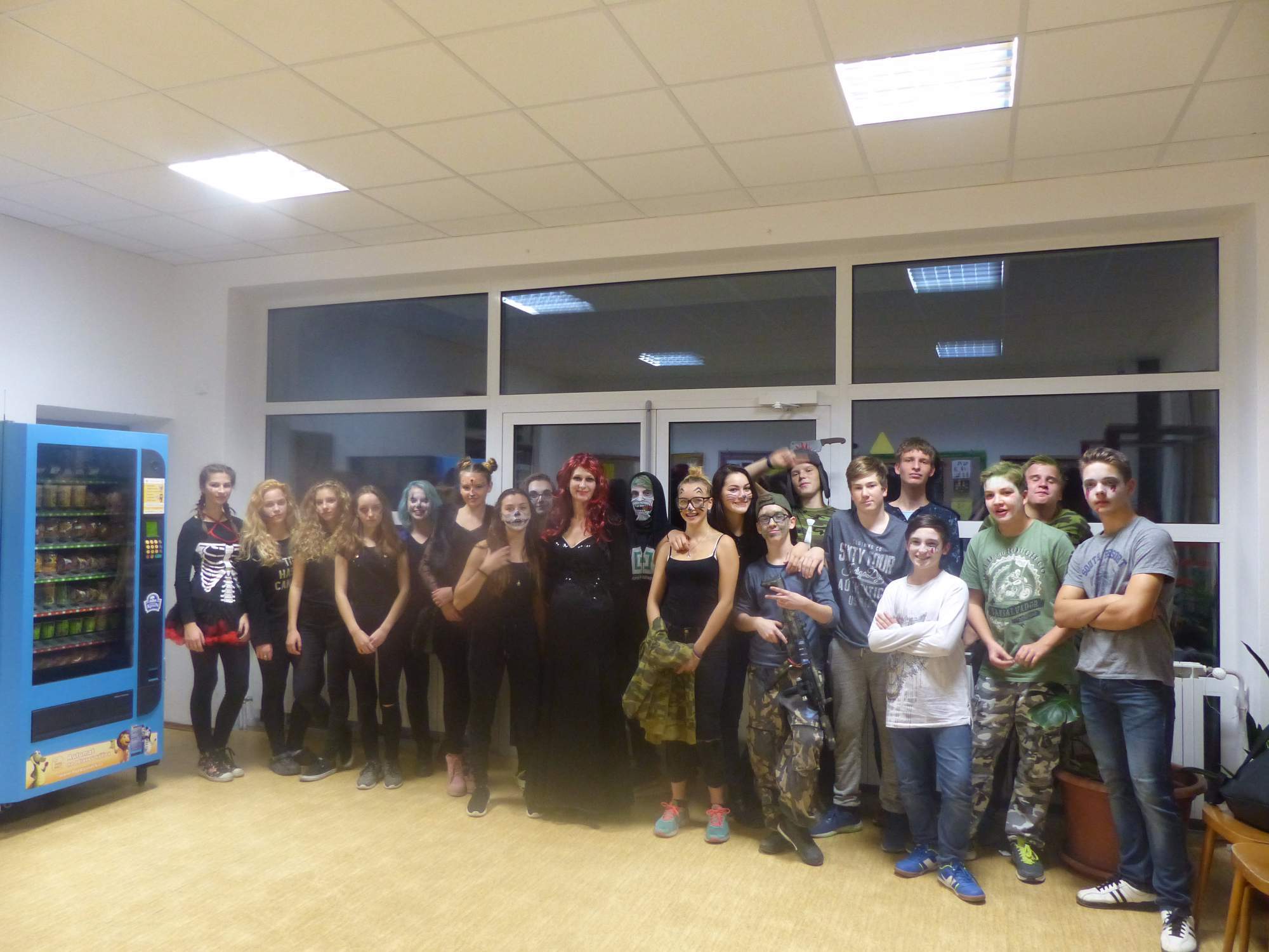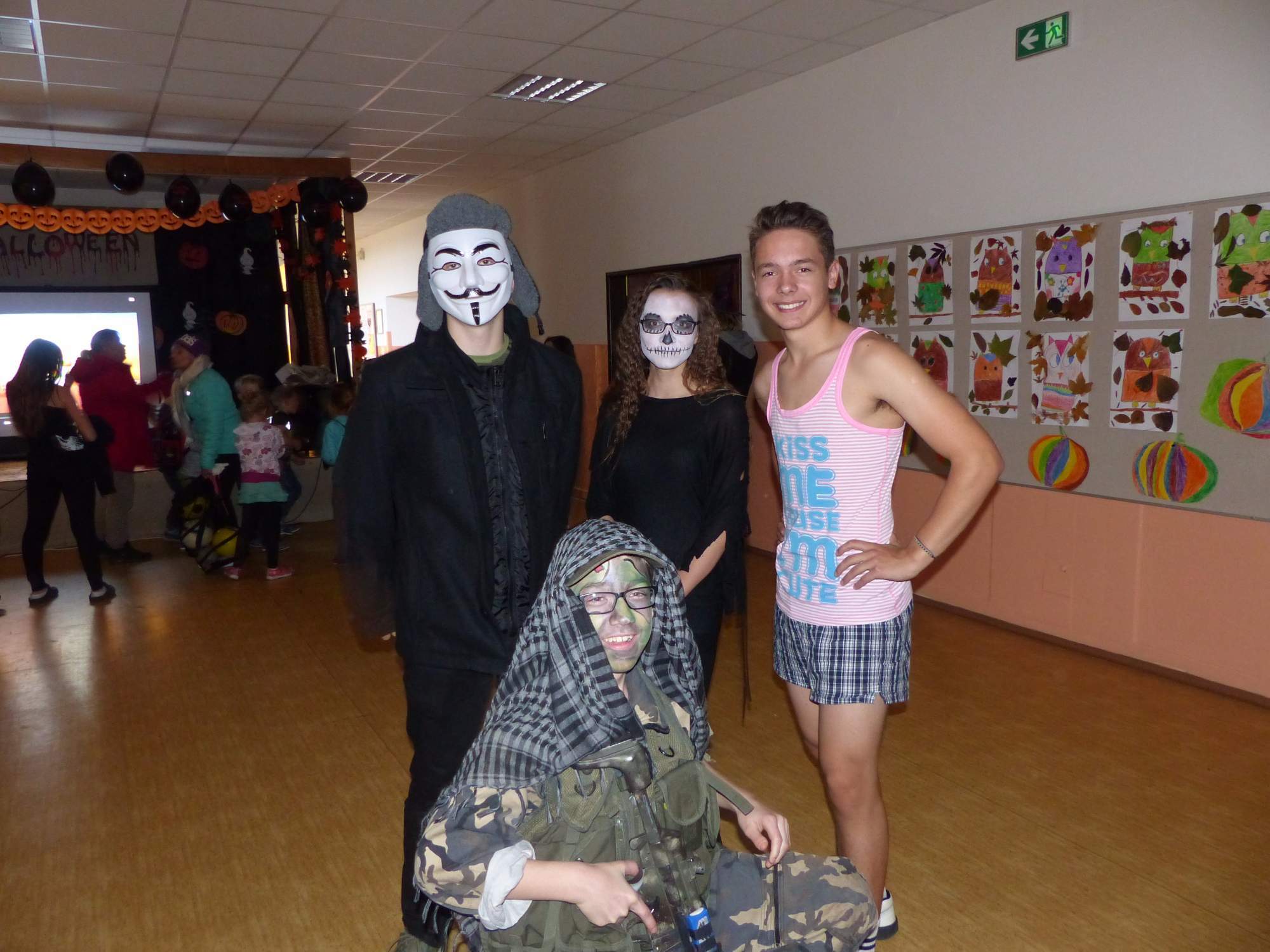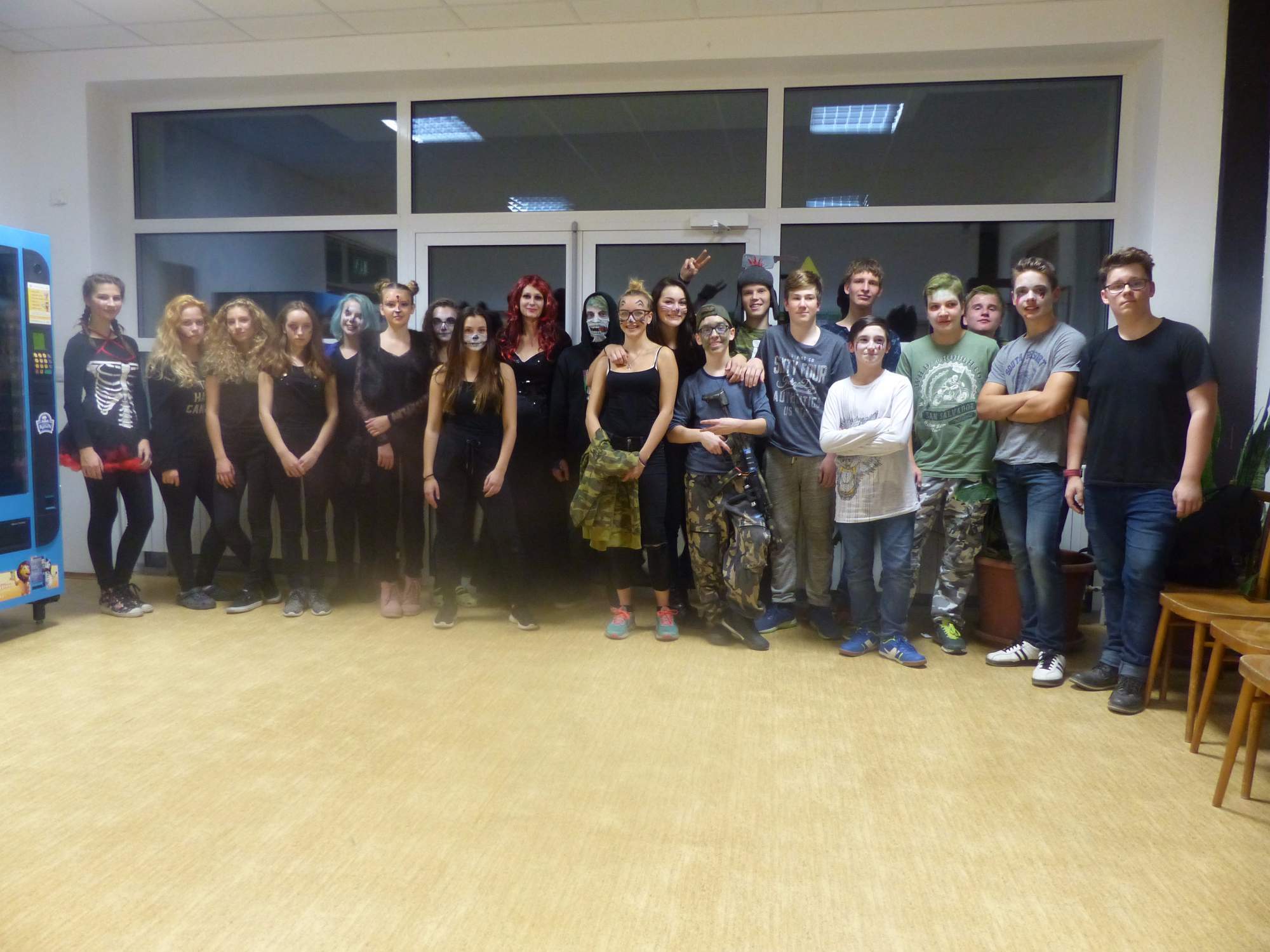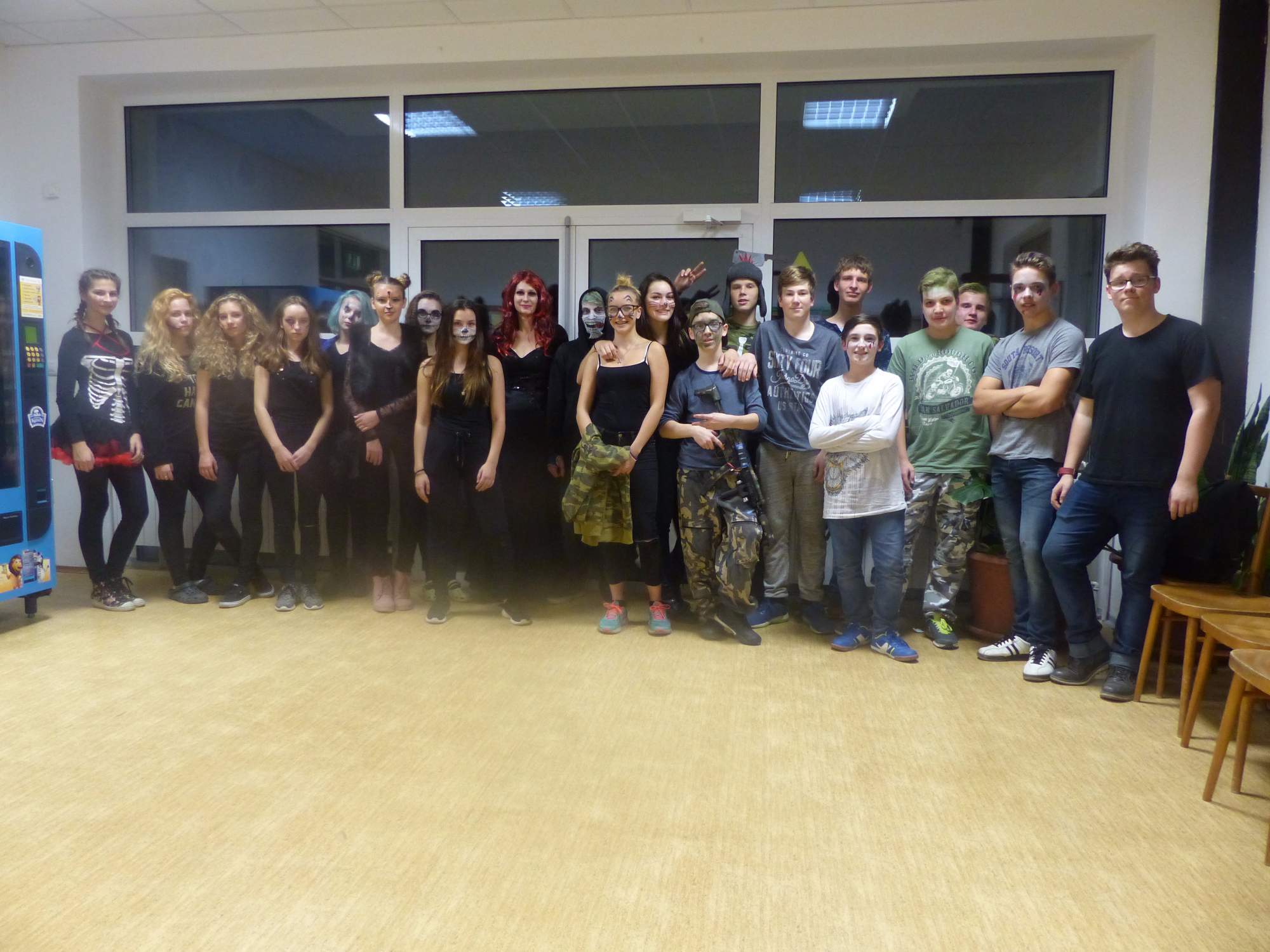 Všichni účastníci do puntíku splnili jedinou podmínku – museli přijít v maskách, takže už u vchodu jsme některé žáky nepoznávali. Po úvodním přivítání, kterého se chopila Gabča Vinklerová, propukla módní přehlídka moderovaná Soňou Krčkovou, v roli modelek upírky, strašilky a příšery ze 6.B. Kde, jak a proč se začal slavit Halloween otestoval kvíz, který připravili Dan Šácha a Ondra Špendlík. Pak jsme čekali na překvapení – ovšem nečekali jsme nehybně, neboť celá aula se roztančila ve stylu Just Dance a snažila se vlnit stejně tak, jako Róza Slováčková a Anička Novotná. A najednou – z ničeho nic se mezi námi ocitla zombie: mrtvolný pohled, rozdrásané tričko, nebezpečně pomalé pohyby… A už po nás šla – tedy šel. To bylo ono slibované překvapení, multiumělec Charles. Mohli jsme pak obdivovat až strašnou hru jeho svalů, které předvedl při tanci. Musíme uznat, že žáci, které si vybral ke spoluúčinkování, mu mnohdy směle konkurovali! A byl nejvyšší čas vydat se na stezku odvahy. Za pomoci pana školníka deváťáci pod vedením Davida Váni a asistence Dominika Kostky připravili hrůzostrašné nástrahy při průchodu školním sklepem. Nebudeme mnoho prozrazovat, ale svou roli sehrála i tarantule, pomůcky z přírodopisného kabinetu (kostlivec, „Anča“) a jiné děsivosti (v neposlední řadě sami deváťáci…). Na konci stezky byli odvážlivci odměněni perníčkem (samozřejmě halloweenským, třeba ve tvaru netopýra, napekla paní učitelka Hromadová s osmáky). Důkazem toho, kolik lidí stezku zvládlo, je podpisová listina – samozřejmě se každý podepsal přiloženou krví… A pak se pilo (Nápoj věčného mládí, Krev jednorožce, Elixír lásky), tančilo, strašilo, kecalo… No prostě party jak má být.