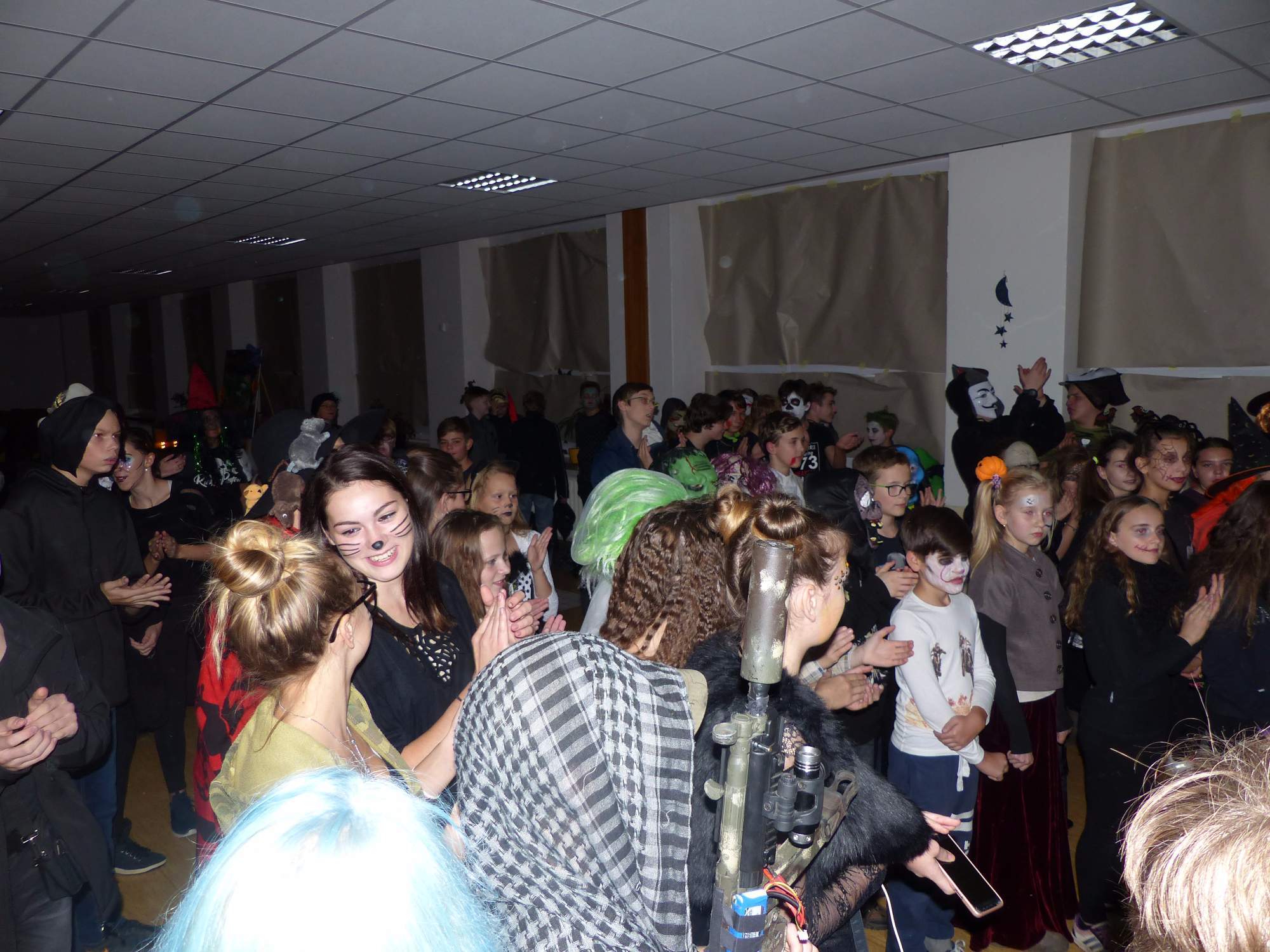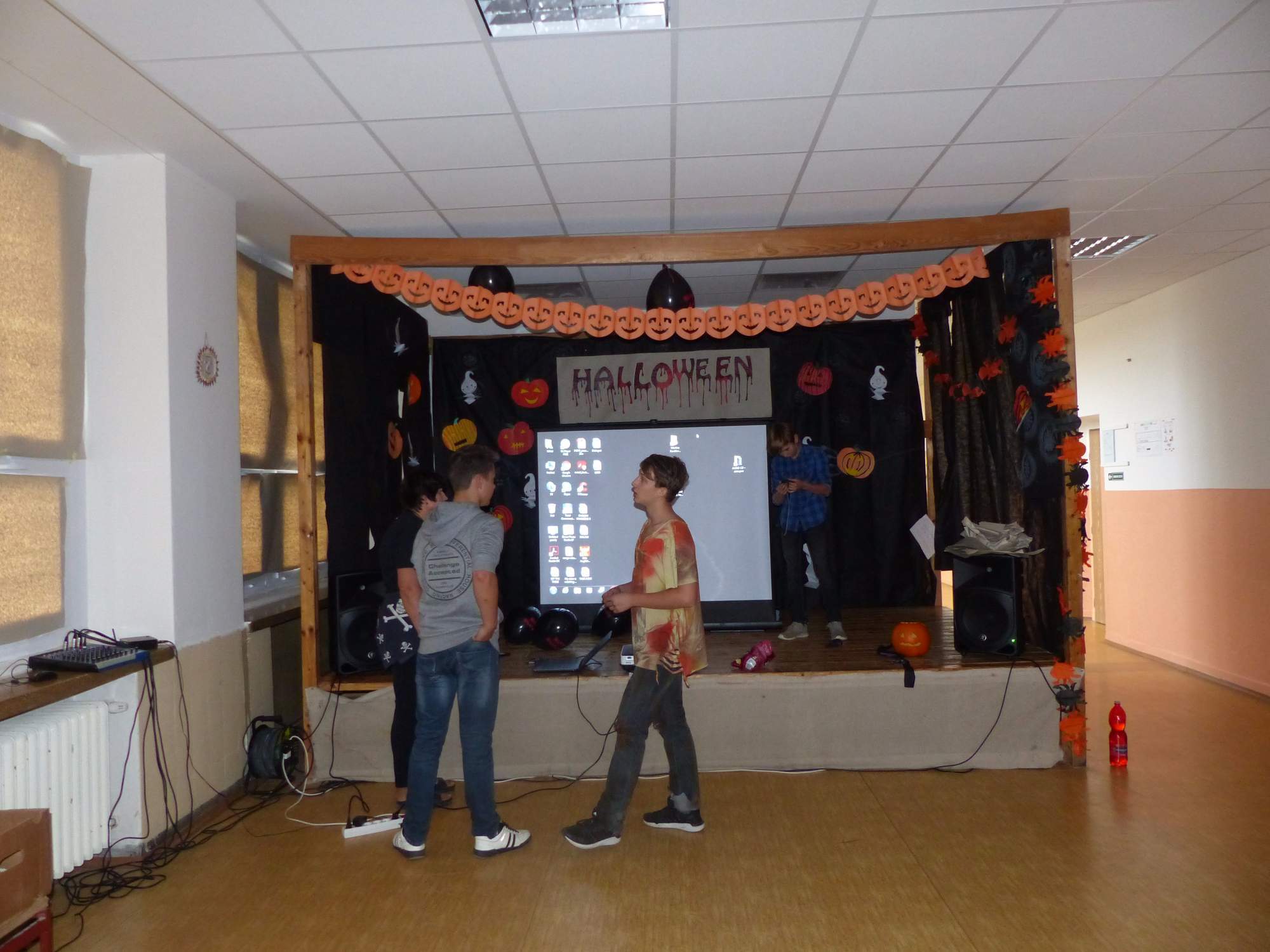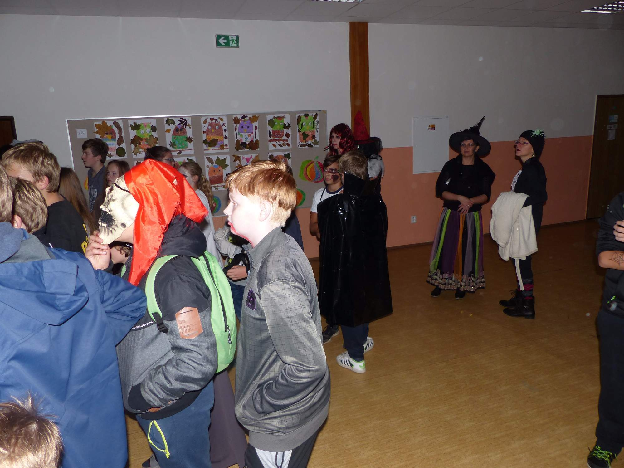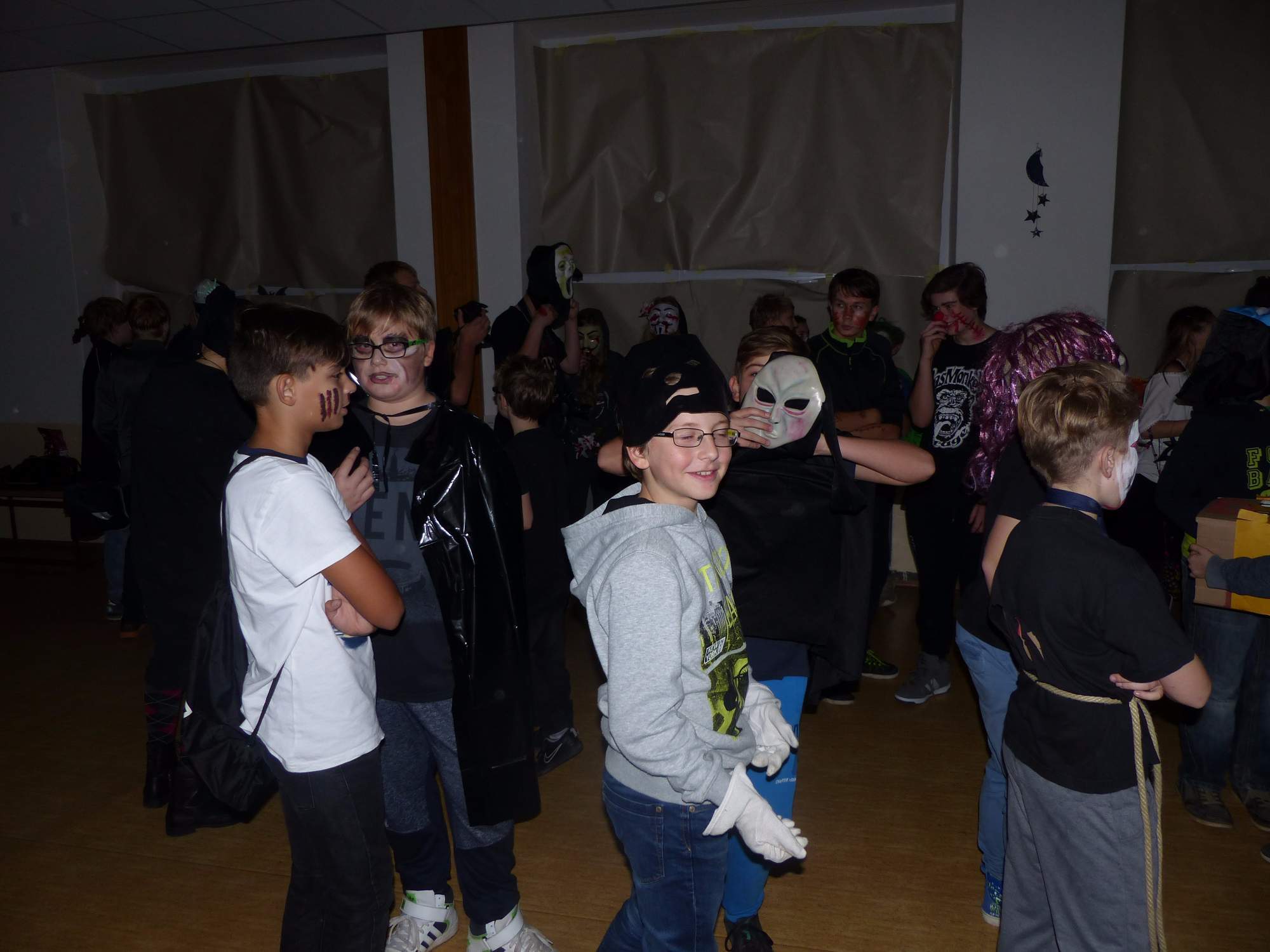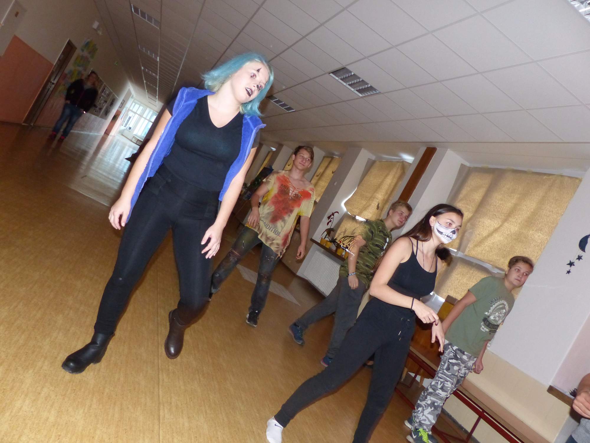 Všichni účastníci do puntíku splnili jedinou podmínku – museli přijít v maskách, takže už u vchodu jsme některé žáky nepoznávali. Po úvodním přivítání, kterého se chopila Gabča Vinklerová, propukla módní přehlídka moderovaná Soňou Krčkovou, v roli modelek upírky, strašilky a příšery ze 6.B. Kde, jak a proč se začal slavit Halloween otestoval kvíz, který připravili Dan Šácha a Ondra Špendlík. Pak jsme čekali na překvapení – ovšem nečekali jsme nehybně, neboť celá aula se roztančila ve stylu Just Dance a snažila se vlnit stejně tak, jako Róza Slováčková a Anička Novotná. A najednou – z ničeho nic se mezi námi ocitla zombie: mrtvolný pohled, rozdrásané tričko, nebezpečně pomalé pohyby… A už po nás šla – tedy šel. To bylo ono slibované překvapení, multiumělec Charles. Mohli jsme pak obdivovat až strašnou hru jeho svalů, které předvedl při tanci. Musíme uznat, že žáci, které si vybral ke spoluúčinkování, mu mnohdy směle konkurovali! A byl nejvyšší čas vydat se na stezku odvahy. Za pomoci pana školníka deváťáci pod vedením Davida Váni a asistence Dominika Kostky připravili hrůzostrašné nástrahy při průchodu školním sklepem. Nebudeme mnoho prozrazovat, ale svou roli sehrála i tarantule, pomůcky z přírodopisného kabinetu (kostlivec, „Anča“) a jiné děsivosti (v neposlední řadě sami deváťáci…). Na konci stezky byli odvážlivci odměněni perníčkem (samozřejmě halloweenským, třeba ve tvaru netopýra, napekla paní učitelka Hromadová s osmáky). Důkazem toho, kolik lidí stezku zvládlo, je podpisová listina – samozřejmě se každý podepsal přiloženou krví… A pak se pilo (Nápoj věčného mládí, Krev jednorožce, Elixír lásky), tančilo, strašilo, kecalo… No prostě party jak má být.