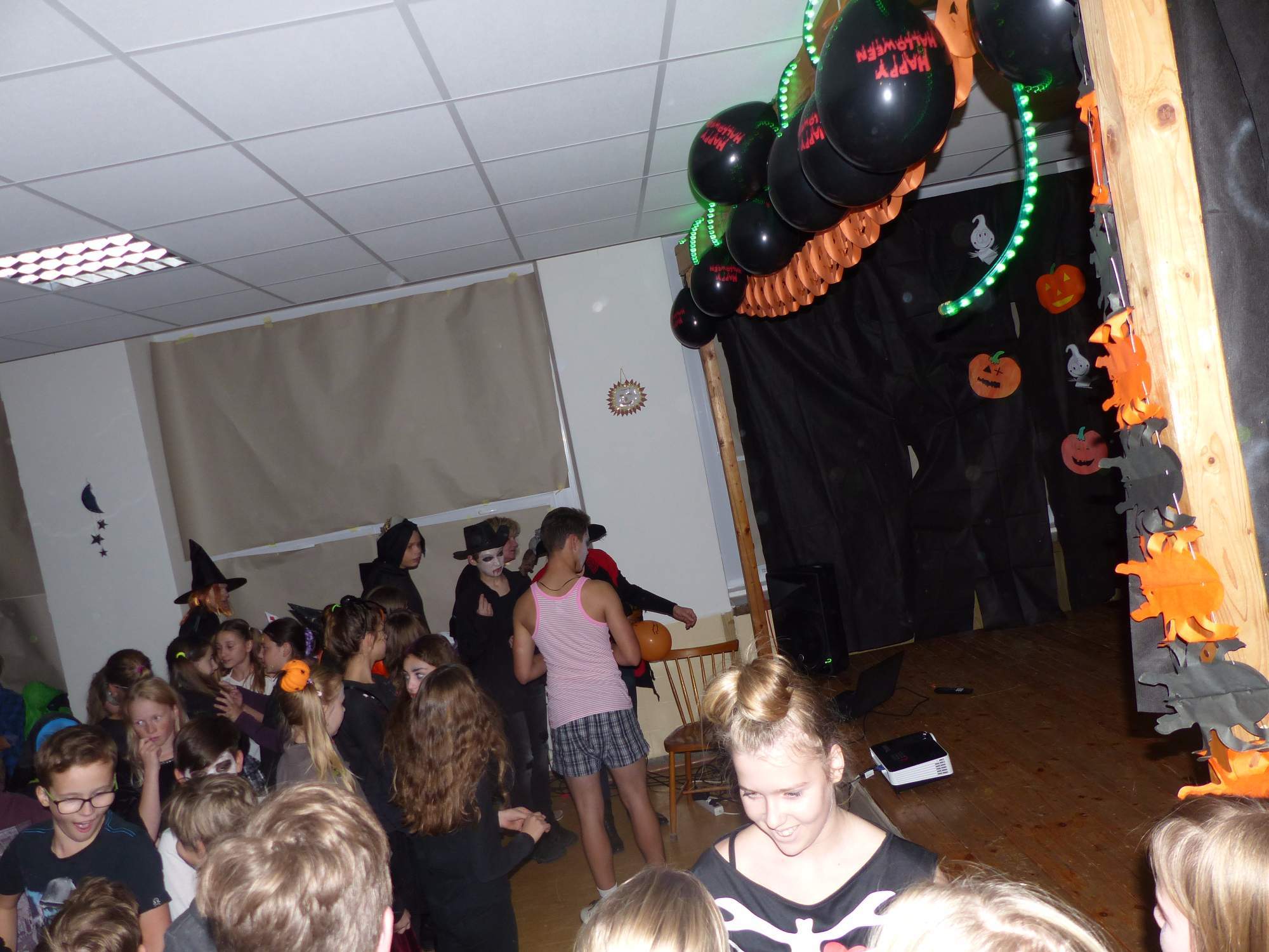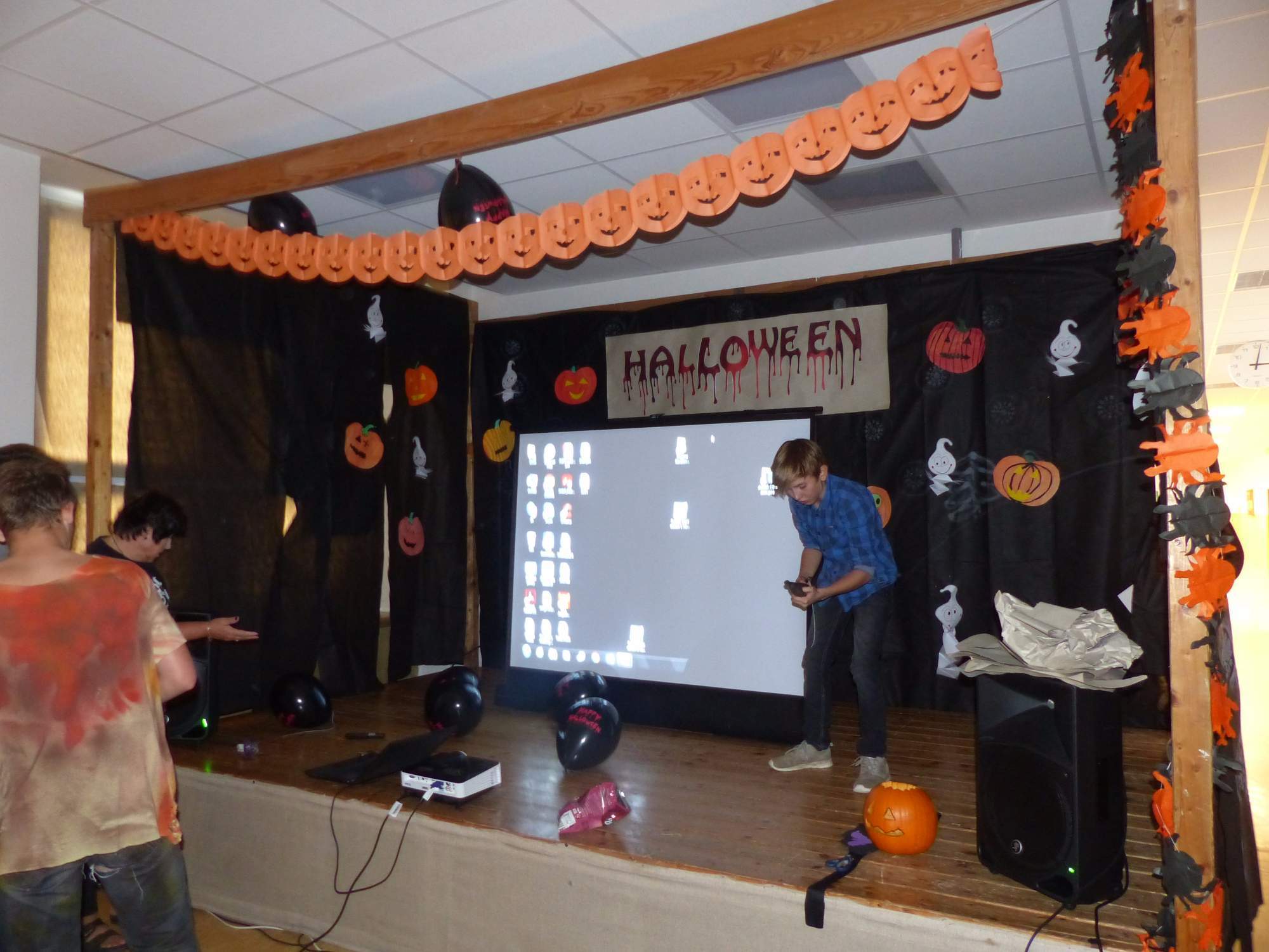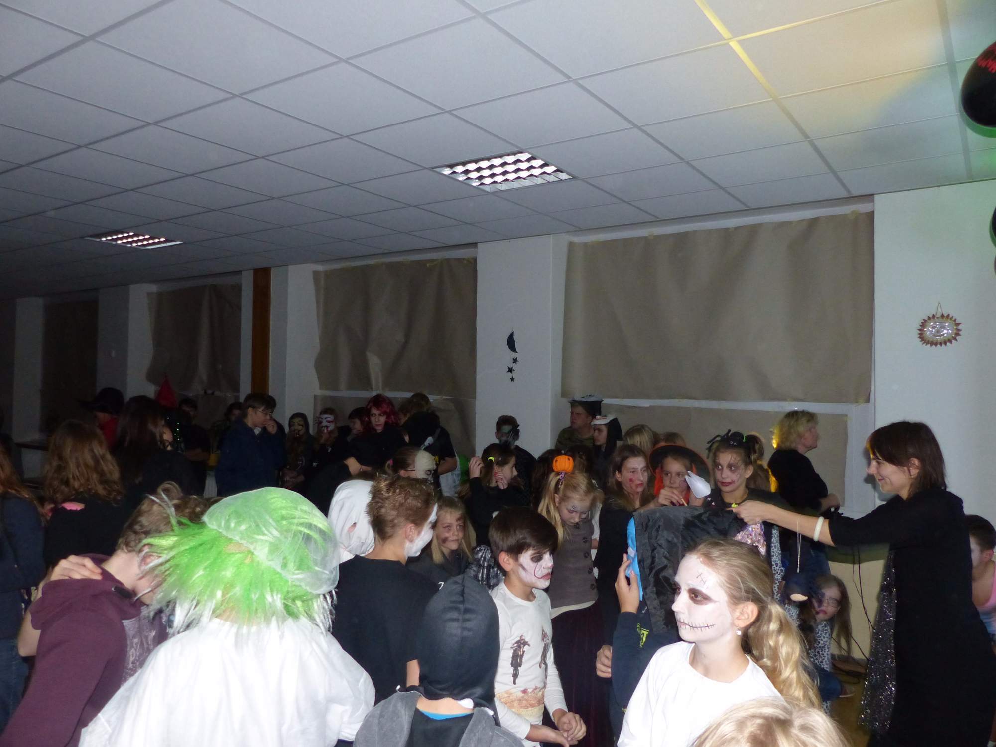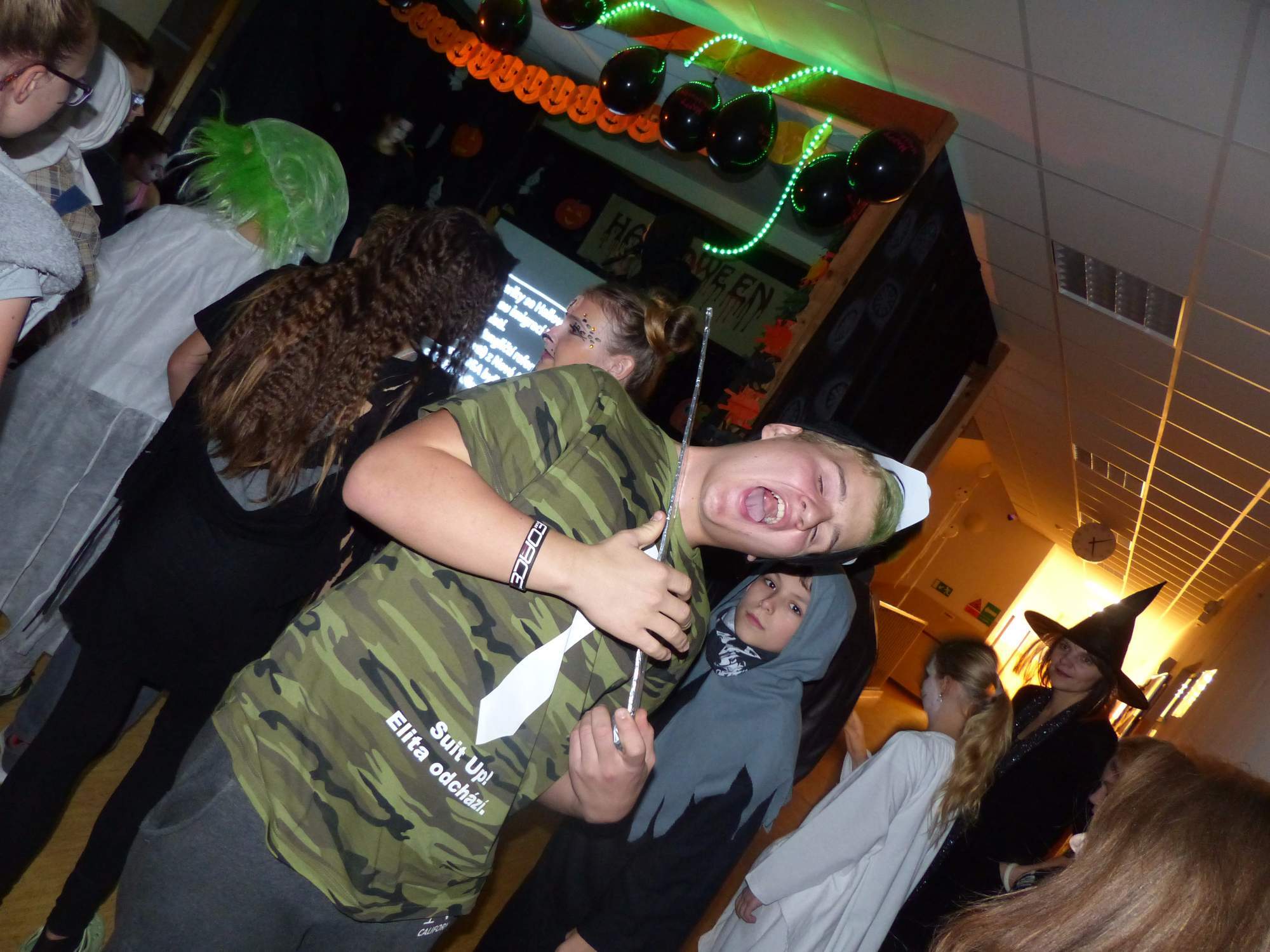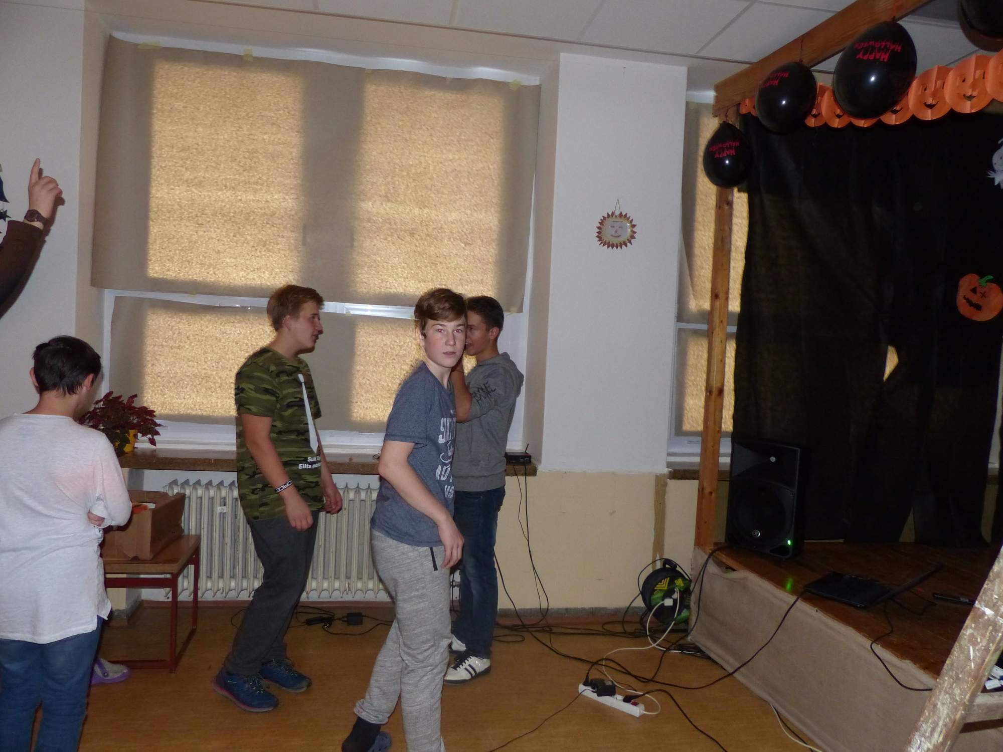 Všichni účastníci do puntíku splnili jedinou podmínku – museli přijít v maskách, takže už u vchodu jsme některé žáky nepoznávali. Po úvodním přivítání, kterého se chopila Gabča Vinklerová, propukla módní přehlídka moderovaná Soňou Krčkovou, v roli modelek upírky, strašilky a příšery ze 6.B. Kde, jak a proč se začal slavit Halloween otestoval kvíz, který připravili Dan Šácha a Ondra Špendlík. Pak jsme čekali na překvapení – ovšem nečekali jsme nehybně, neboť celá aula se roztančila ve stylu Just Dance a snažila se vlnit stejně tak, jako Róza Slováčková a Anička Novotná. A najednou – z ničeho nic se mezi námi ocitla zombie: mrtvolný pohled, rozdrásané tričko, nebezpečně pomalé pohyby… A už po nás šla – tedy šel. To bylo ono slibované překvapení, multiumělec Charles. Mohli jsme pak obdivovat až strašnou hru jeho svalů, které předvedl při tanci. Musíme uznat, že žáci, které si vybral ke spoluúčinkování, mu mnohdy směle konkurovali! A byl nejvyšší čas vydat se na stezku odvahy. Za pomoci pana školníka deváťáci pod vedením Davida Váni a asistence Dominika Kostky připravili hrůzostrašné nástrahy při průchodu školním sklepem. Nebudeme mnoho prozrazovat, ale svou roli sehrála i tarantule, pomůcky z přírodopisného kabinetu (kostlivec, „Anča“) a jiné děsivosti (v neposlední řadě sami deváťáci…). Na konci stezky byli odvážlivci odměněni perníčkem (samozřejmě halloweenským, třeba ve tvaru netopýra, napekla paní učitelka Hromadová s osmáky). Důkazem toho, kolik lidí stezku zvládlo, je podpisová listina – samozřejmě se každý podepsal přiloženou krví… A pak se pilo (Nápoj věčného mládí, Krev jednorožce, Elixír lásky), tančilo, strašilo, kecalo… No prostě party jak má být.