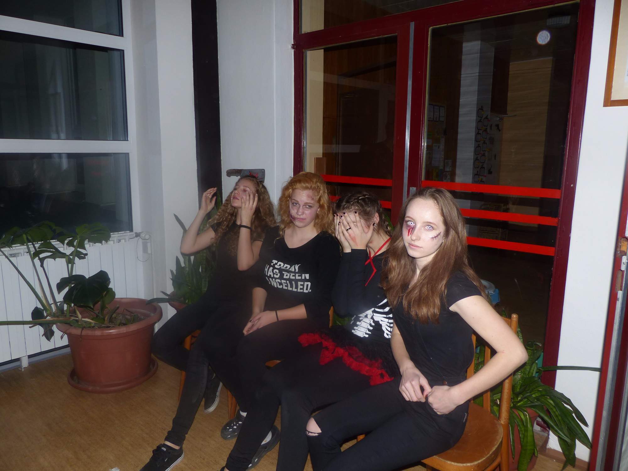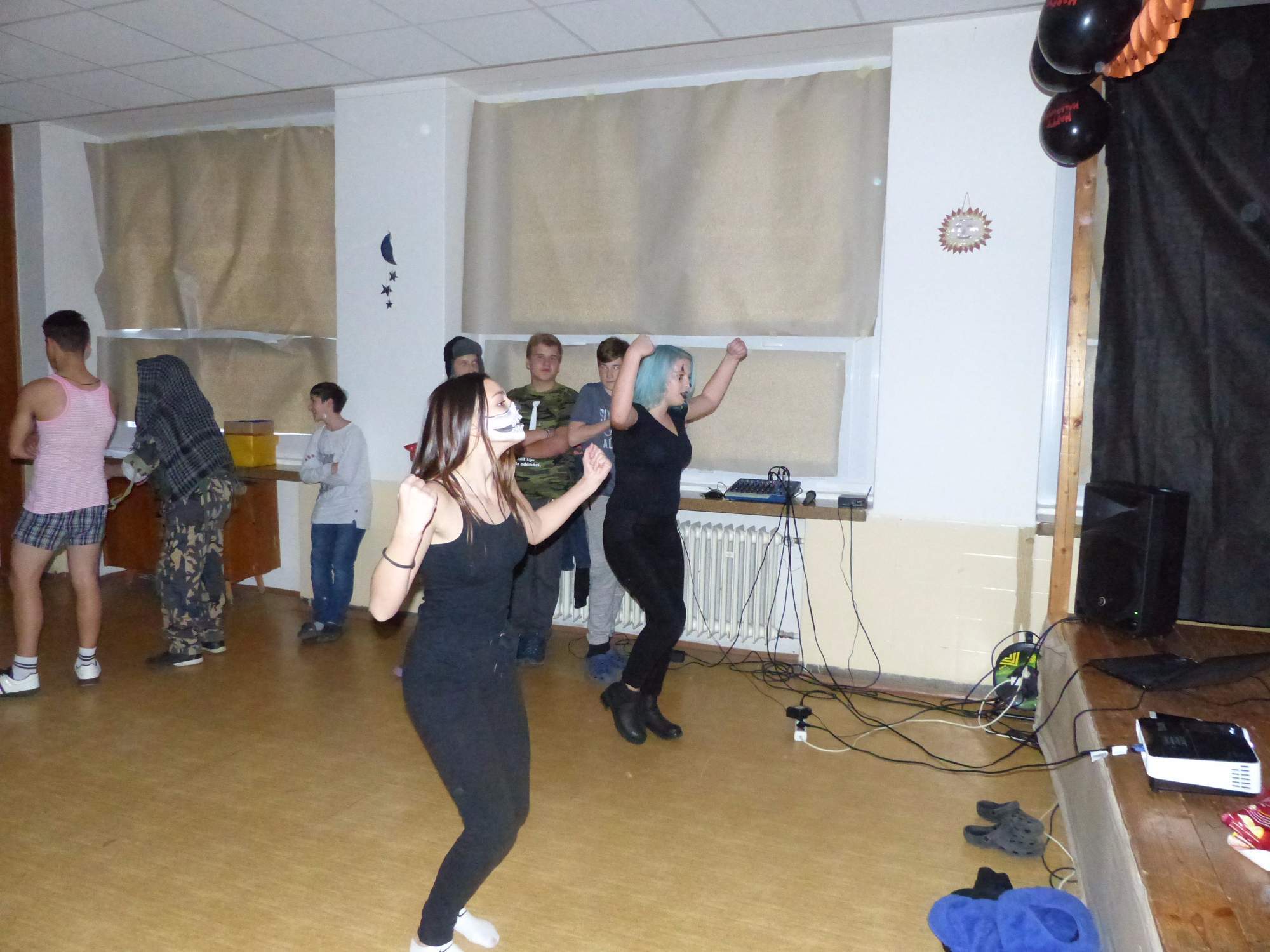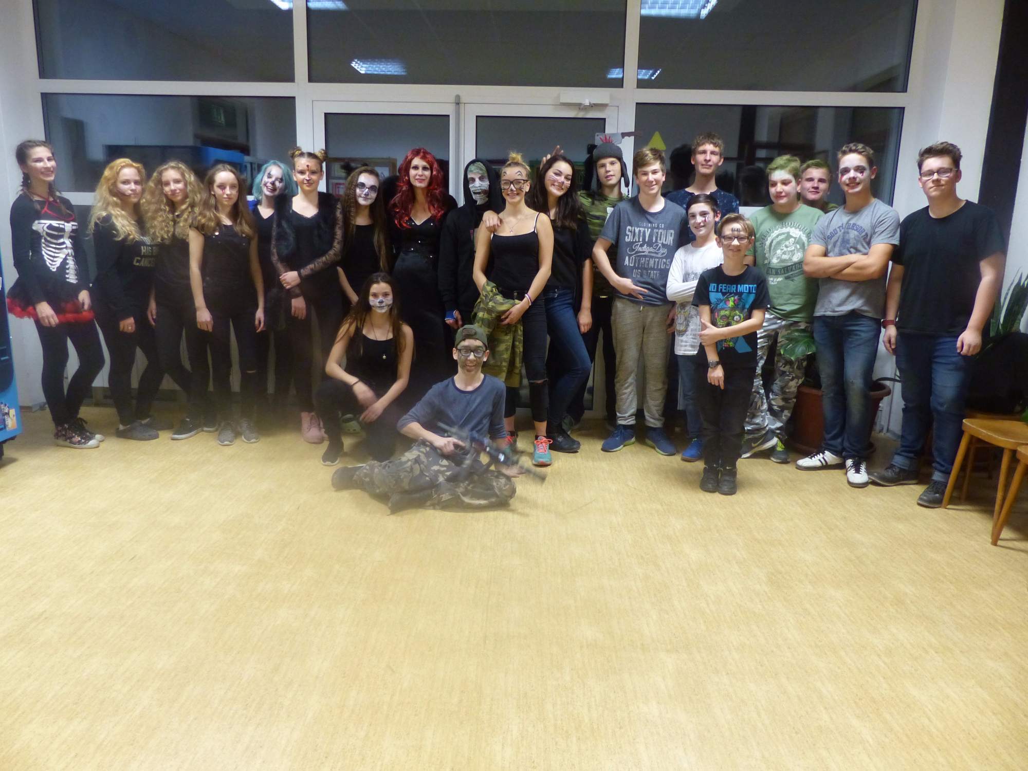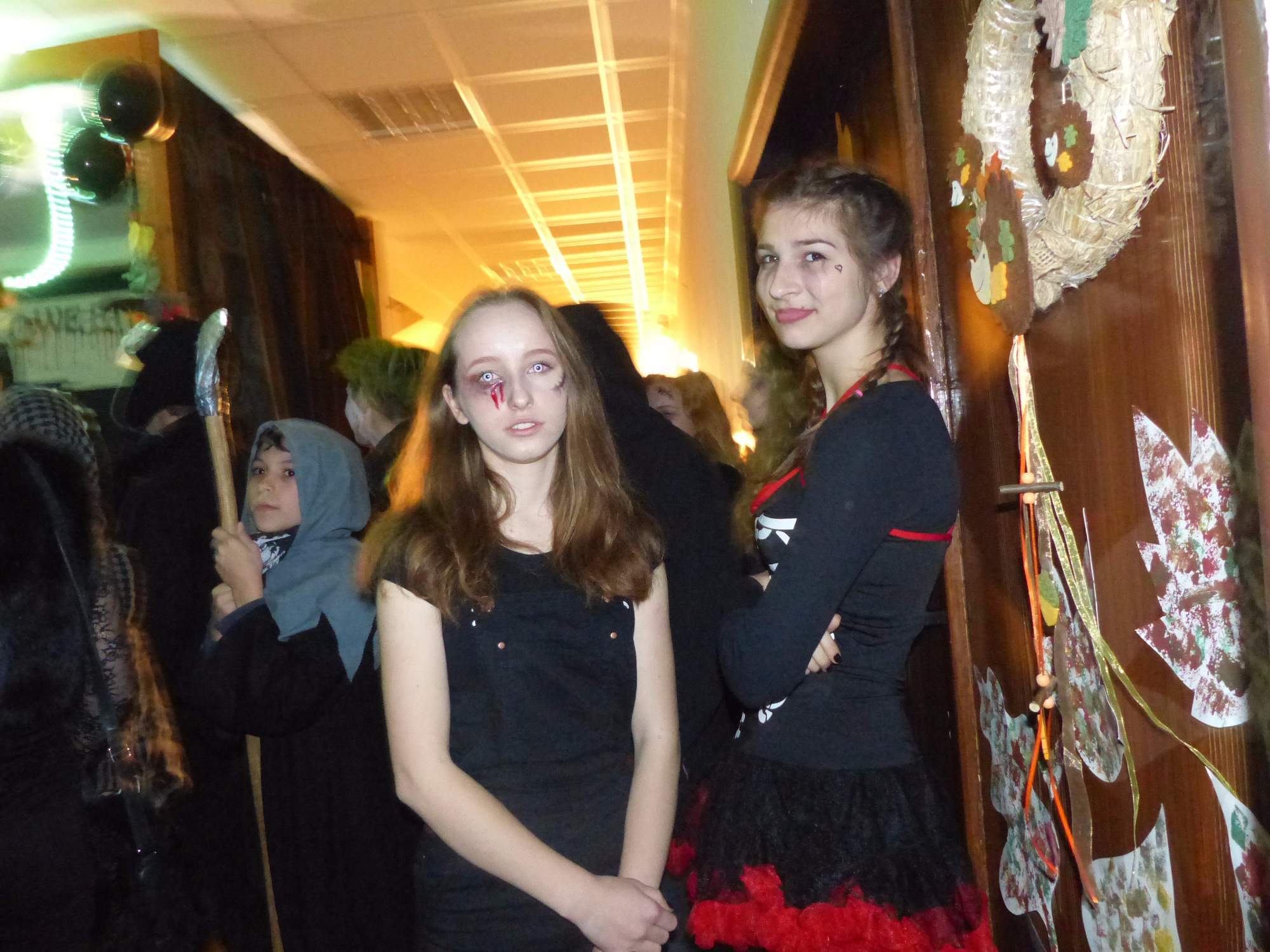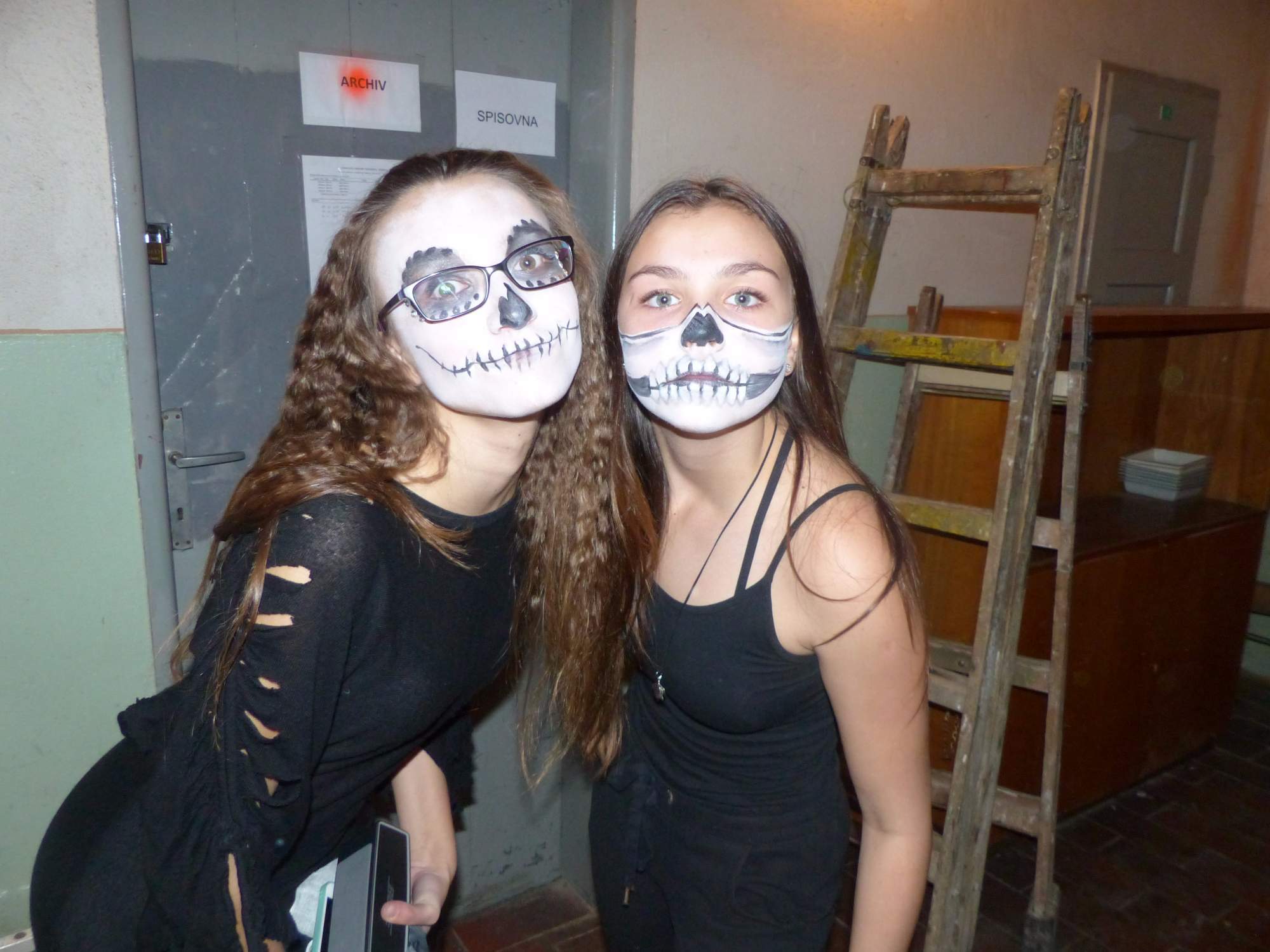 Všichni účastníci do puntíku splnili jedinou podmínku – museli přijít v maskách, takže už u vchodu jsme některé žáky nepoznávali. Po úvodním přivítání, kterého se chopila Gabča Vinklerová, propukla módní přehlídka moderovaná Soňou Krčkovou, v roli modelek upírky, strašilky a příšery ze 6.B. Kde, jak a proč se začal slavit Halloween otestoval kvíz, který připravili Dan Šácha a Ondra Špendlík. Pak jsme čekali na překvapení – ovšem nečekali jsme nehybně, neboť celá aula se roztančila ve stylu Just Dance a snažila se vlnit stejně tak, jako Róza Slováčková a Anička Novotná. A najednou – z ničeho nic se mezi námi ocitla zombie: mrtvolný pohled, rozdrásané tričko, nebezpečně pomalé pohyby… A už po nás šla – tedy šel. To bylo ono slibované překvapení, multiumělec Charles. Mohli jsme pak obdivovat až strašnou hru jeho svalů, které předvedl při tanci. Musíme uznat, že žáci, které si vybral ke spoluúčinkování, mu mnohdy směle konkurovali! A byl nejvyšší čas vydat se na stezku odvahy. Za pomoci pana školníka deváťáci pod vedením Davida Váni a asistence Dominika Kostky připravili hrůzostrašné nástrahy při průchodu školním sklepem. Nebudeme mnoho prozrazovat, ale svou roli sehrála i tarantule, pomůcky z přírodopisného kabinetu (kostlivec, „Anča“) a jiné děsivosti (v neposlední řadě sami deváťáci…). Na konci stezky byli odvážlivci odměněni perníčkem (samozřejmě halloweenským, třeba ve tvaru netopýra, napekla paní učitelka Hromadová s osmáky). Důkazem toho, kolik lidí stezku zvládlo, je podpisová listina – samozřejmě se každý podepsal přiloženou krví… A pak se pilo (Nápoj věčného mládí, Krev jednorožce, Elixír lásky), tančilo, strašilo, kecalo… No prostě party jak má být.