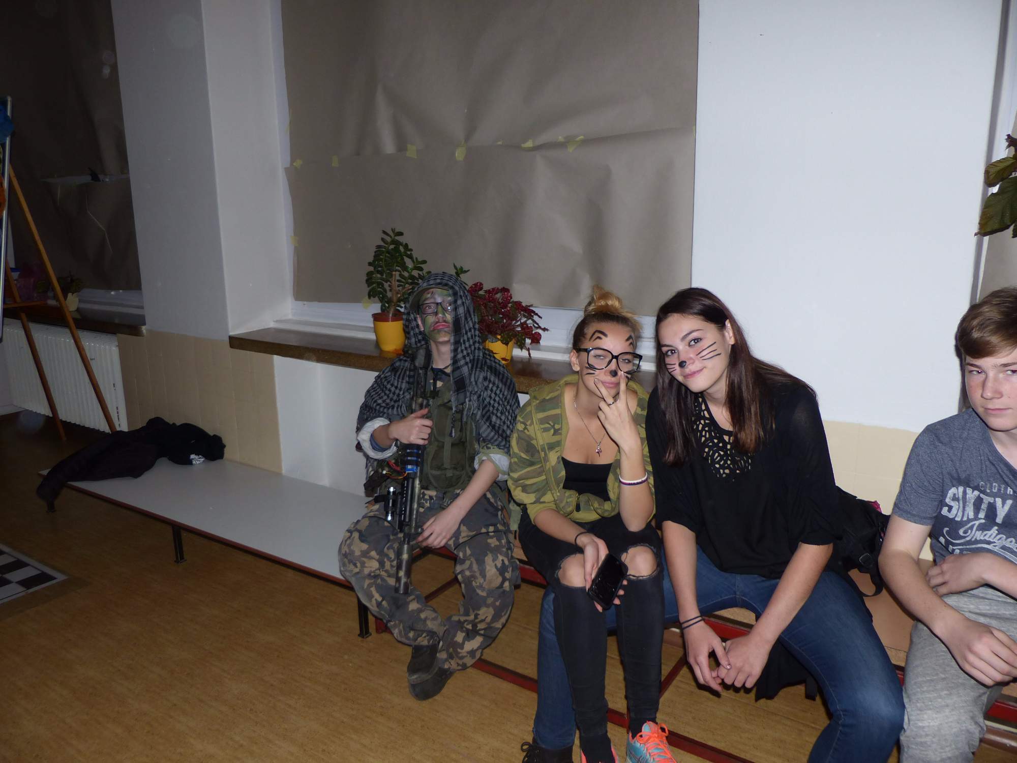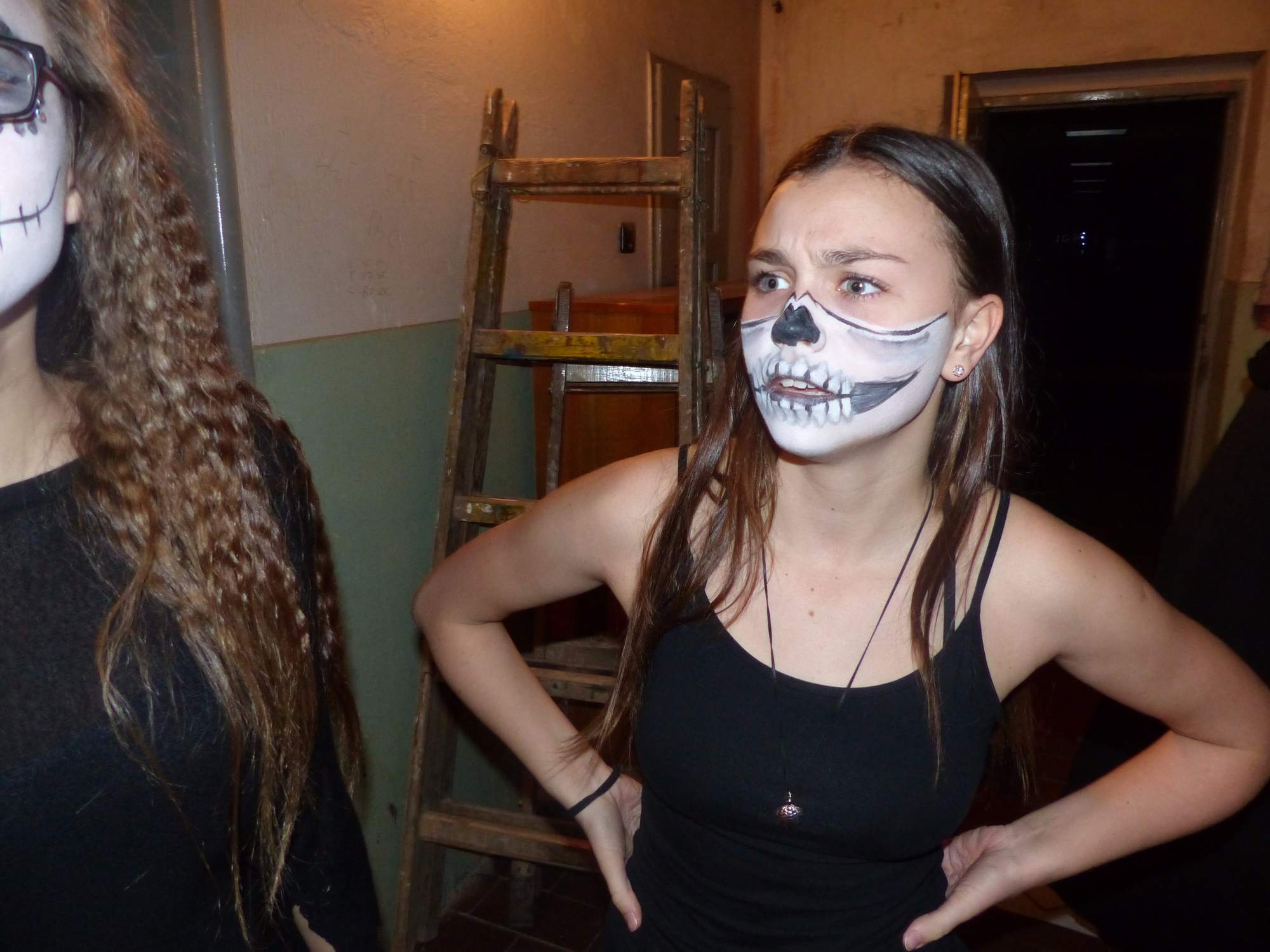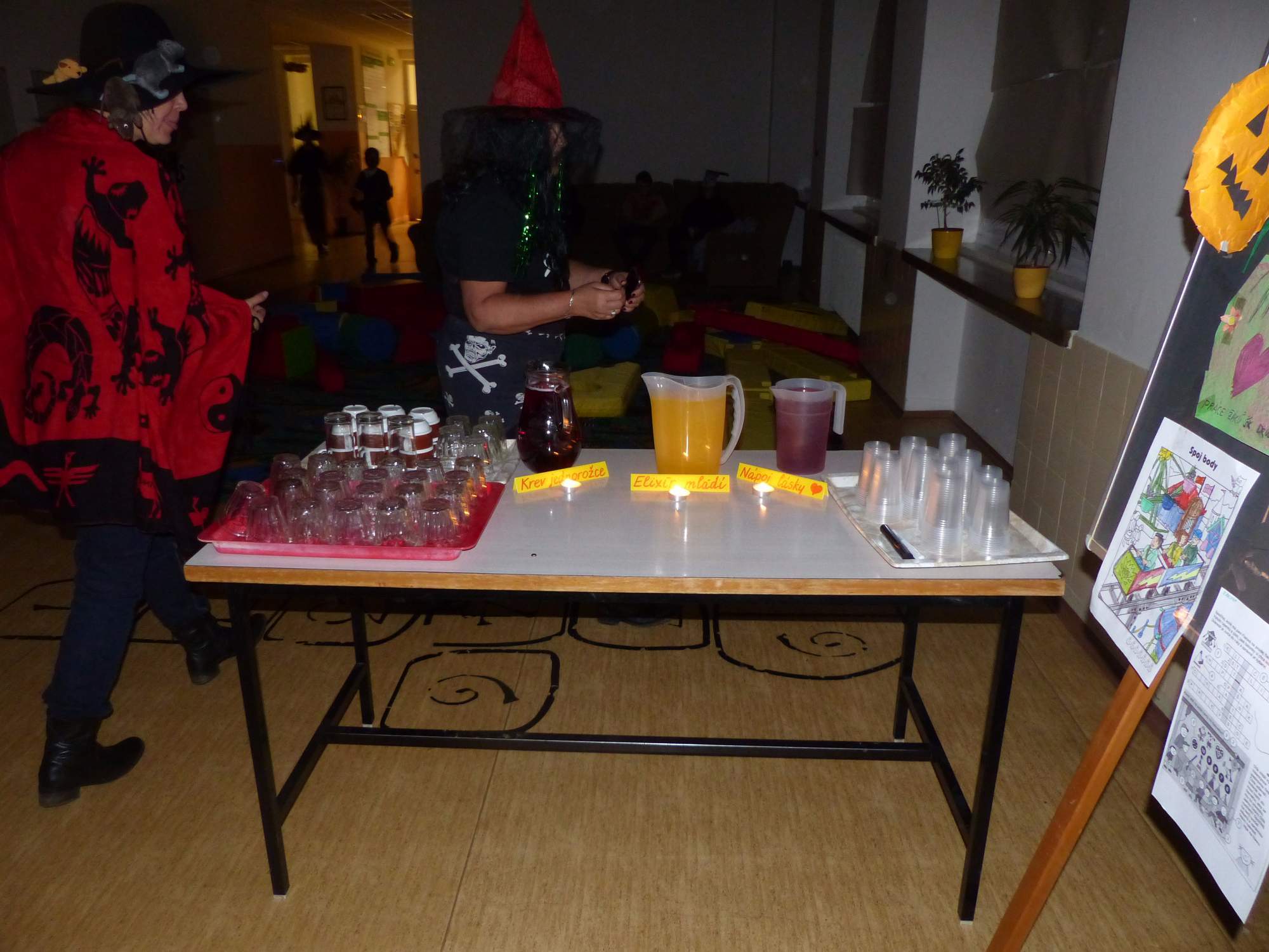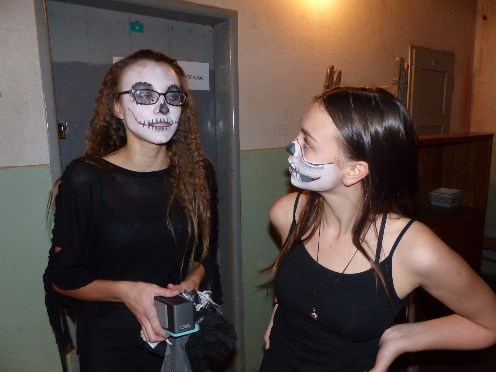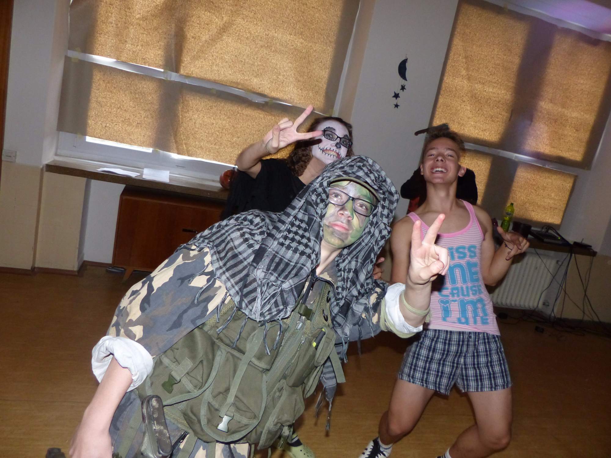 Všichni účastníci do puntíku splnili jedinou podmínku – museli přijít v maskách, takže už u vchodu jsme některé žáky nepoznávali. Po úvodním přivítání, kterého se chopila Gabča Vinklerová, propukla módní přehlídka moderovaná Soňou Krčkovou, v roli modelek upírky, strašilky a příšery ze 6.B. Kde, jak a proč se začal slavit Halloween otestoval kvíz, který připravili Dan Šácha a Ondra Špendlík. Pak jsme čekali na překvapení – ovšem nečekali jsme nehybně, neboť celá aula se roztančila ve stylu Just Dance a snažila se vlnit stejně tak, jako Róza Slováčková a Anička Novotná. A najednou – z ničeho nic se mezi námi ocitla zombie: mrtvolný pohled, rozdrásané tričko, nebezpečně pomalé pohyby… A už po nás šla – tedy šel. To bylo ono slibované překvapení, multiumělec Charles. Mohli jsme pak obdivovat až strašnou hru jeho svalů, které předvedl při tanci. Musíme uznat, že žáci, které si vybral ke spoluúčinkování, mu mnohdy směle konkurovali! A byl nejvyšší čas vydat se na stezku odvahy. Za pomoci pana školníka deváťáci pod vedením Davida Váni a asistence Dominika Kostky připravili hrůzostrašné nástrahy při průchodu školním sklepem. Nebudeme mnoho prozrazovat, ale svou roli sehrála i tarantule, pomůcky z přírodopisného kabinetu (kostlivec, „Anča“) a jiné děsivosti (v neposlední řadě sami deváťáci…). Na konci stezky byli odvážlivci odměněni perníčkem (samozřejmě halloweenským, třeba ve tvaru netopýra, napekla paní učitelka Hromadová s osmáky). Důkazem toho, kolik lidí stezku zvládlo, je podpisová listina – samozřejmě se každý podepsal přiloženou krví… A pak se pilo (Nápoj věčného mládí, Krev jednorožce, Elixír lásky), tančilo, strašilo, kecalo… No prostě party jak má být.