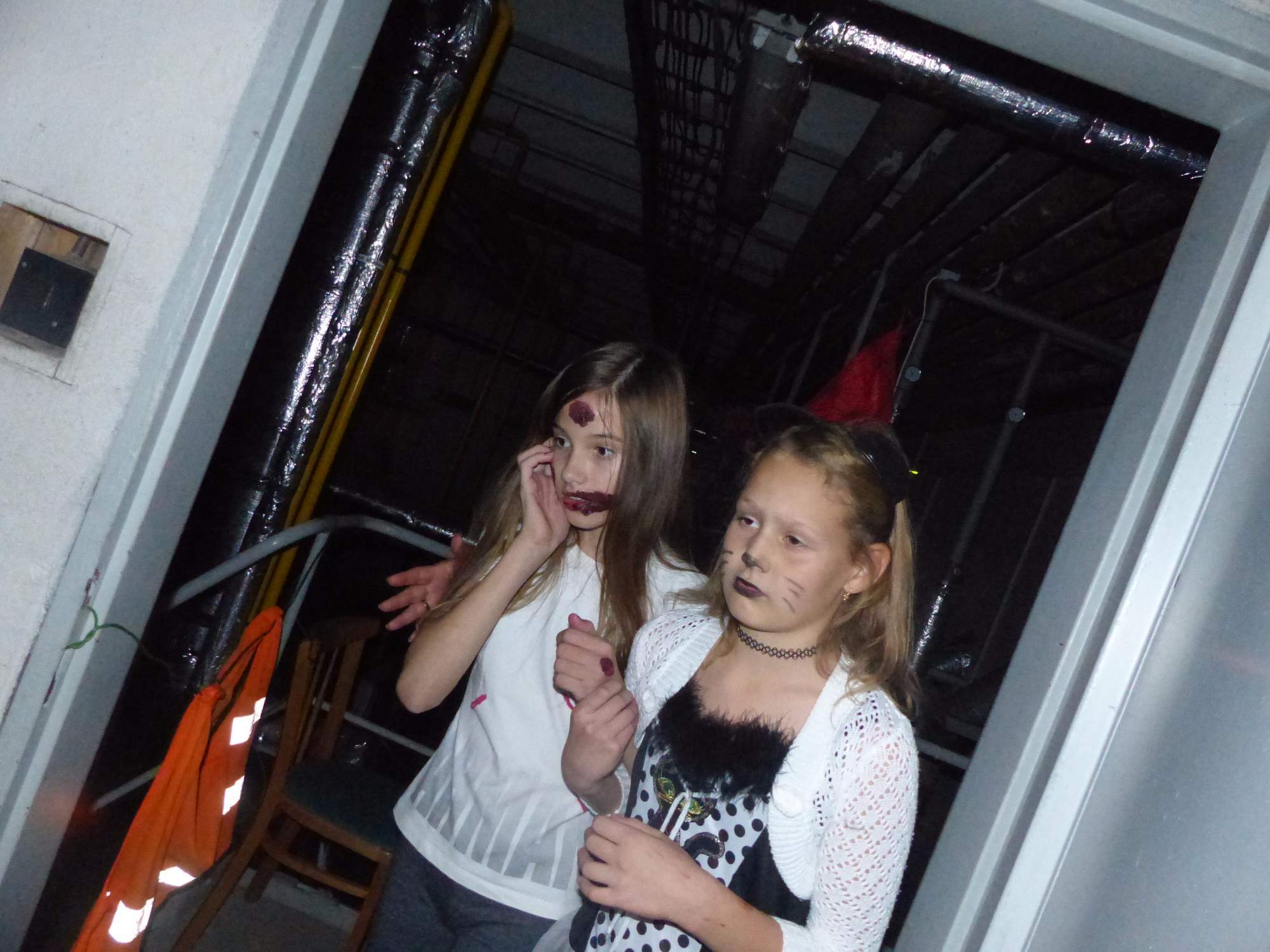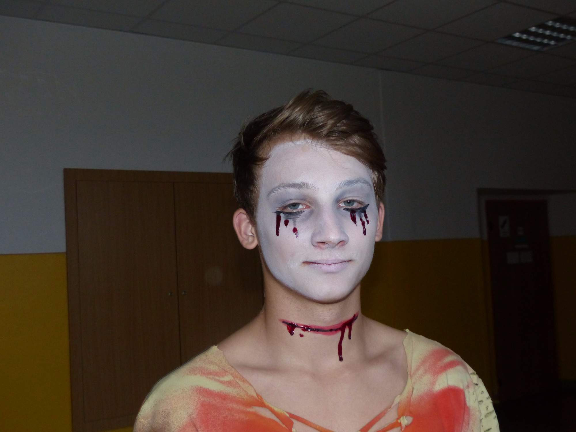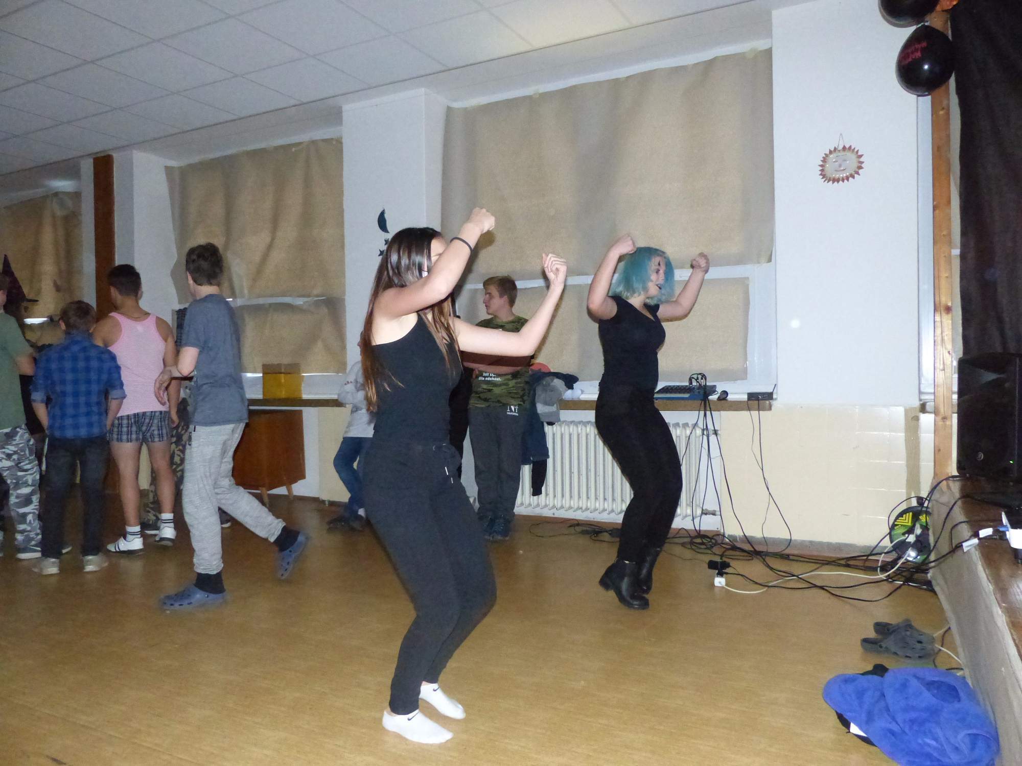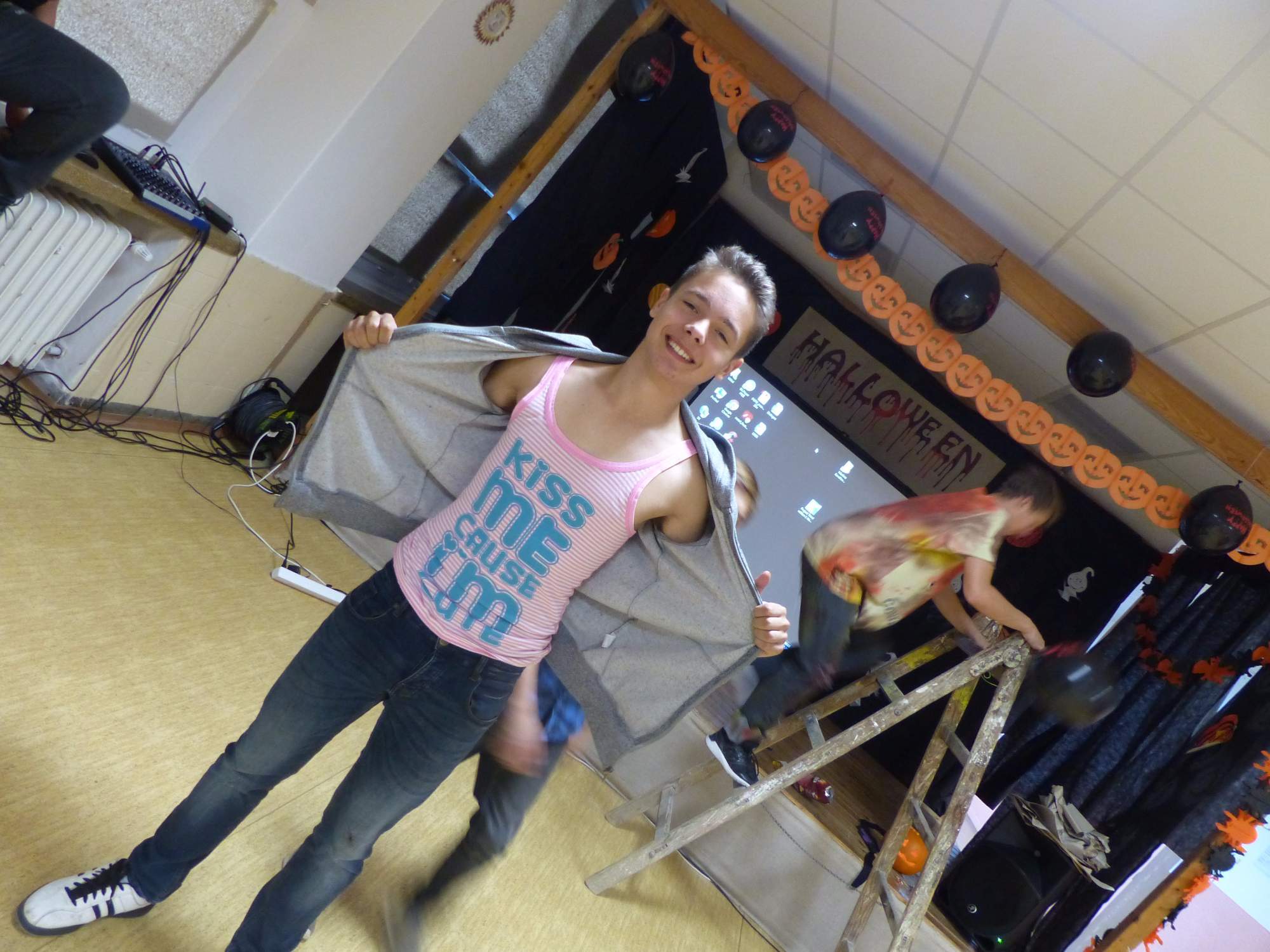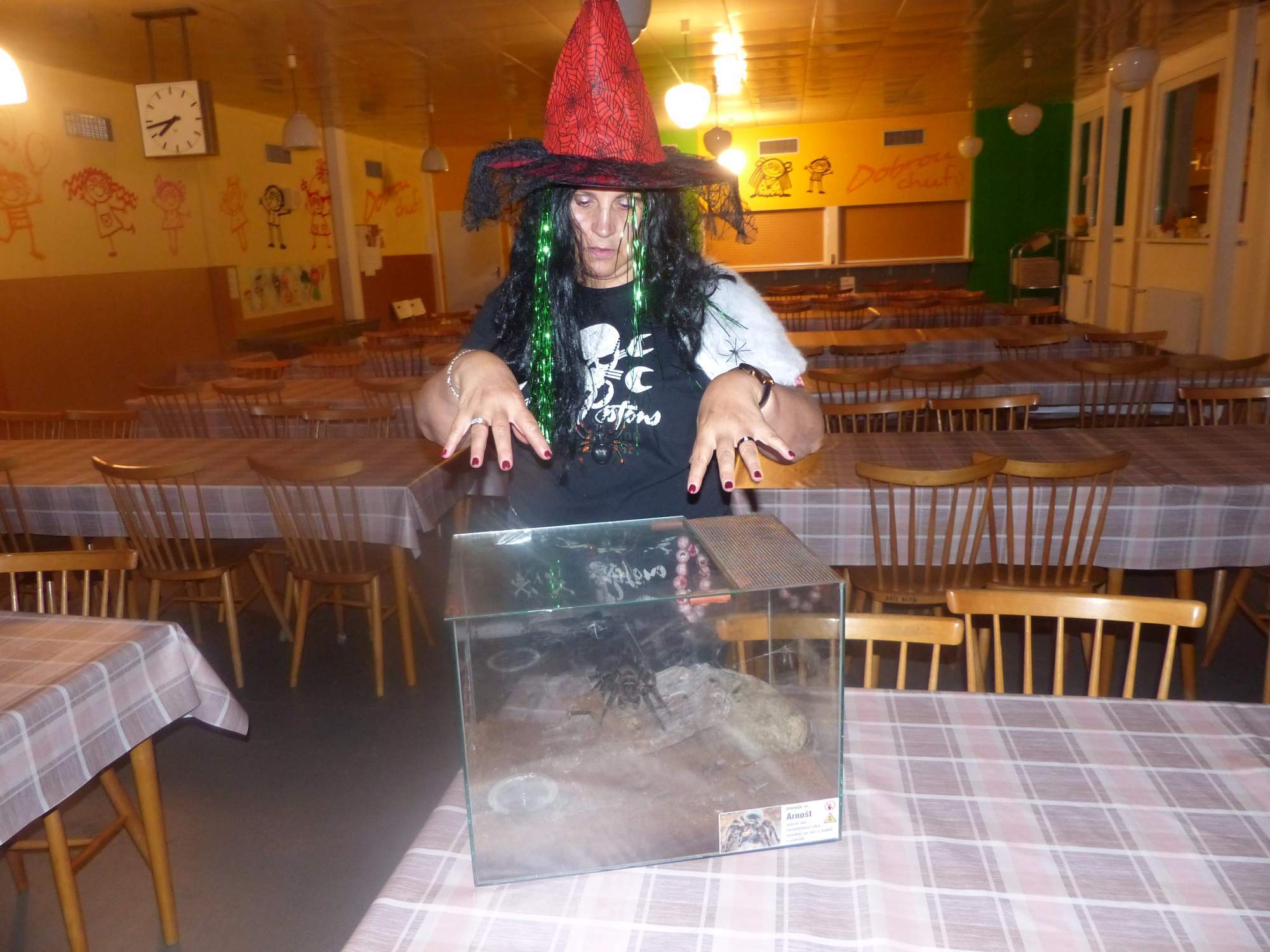 Všichni účastníci do puntíku splnili jedinou podmínku – museli přijít v maskách, takže už u vchodu jsme některé žáky nepoznávali. Po úvodním přivítání, kterého se chopila Gabča Vinklerová, propukla módní přehlídka moderovaná Soňou Krčkovou, v roli modelek upírky, strašilky a příšery ze 6.B. Kde, jak a proč se začal slavit Halloween otestoval kvíz, který připravili Dan Šácha a Ondra Špendlík. Pak jsme čekali na překvapení – ovšem nečekali jsme nehybně, neboť celá aula se roztančila ve stylu Just Dance a snažila se vlnit stejně tak, jako Róza Slováčková a Anička Novotná. A najednou – z ničeho nic se mezi námi ocitla zombie: mrtvolný pohled, rozdrásané tričko, nebezpečně pomalé pohyby… A už po nás šla – tedy šel. To bylo ono slibované překvapení, multiumělec Charles. Mohli jsme pak obdivovat až strašnou hru jeho svalů, které předvedl při tanci. Musíme uznat, že žáci, které si vybral ke spoluúčinkování, mu mnohdy směle konkurovali! A byl nejvyšší čas vydat se na stezku odvahy. Za pomoci pana školníka deváťáci pod vedením Davida Váni a asistence Dominika Kostky připravili hrůzostrašné nástrahy při průchodu školním sklepem. Nebudeme mnoho prozrazovat, ale svou roli sehrála i tarantule, pomůcky z přírodopisného kabinetu (kostlivec, „Anča“) a jiné děsivosti (v neposlední řadě sami deváťáci…). Na konci stezky byli odvážlivci odměněni perníčkem (samozřejmě halloweenským, třeba ve tvaru netopýra, napekla paní učitelka Hromadová s osmáky). Důkazem toho, kolik lidí stezku zvládlo, je podpisová listina – samozřejmě se každý podepsal přiloženou krví… A pak se pilo (Nápoj věčného mládí, Krev jednorožce, Elixír lásky), tančilo, strašilo, kecalo… No prostě party jak má být.