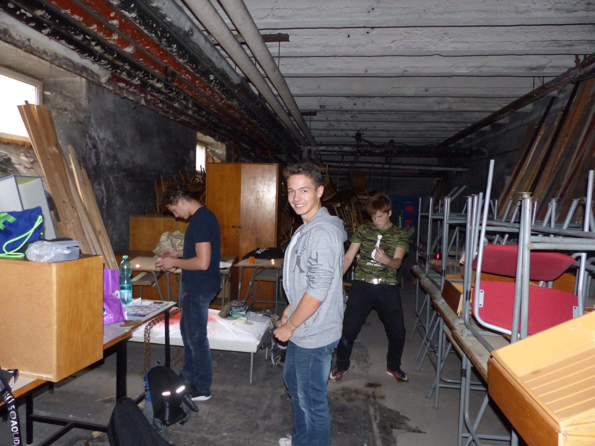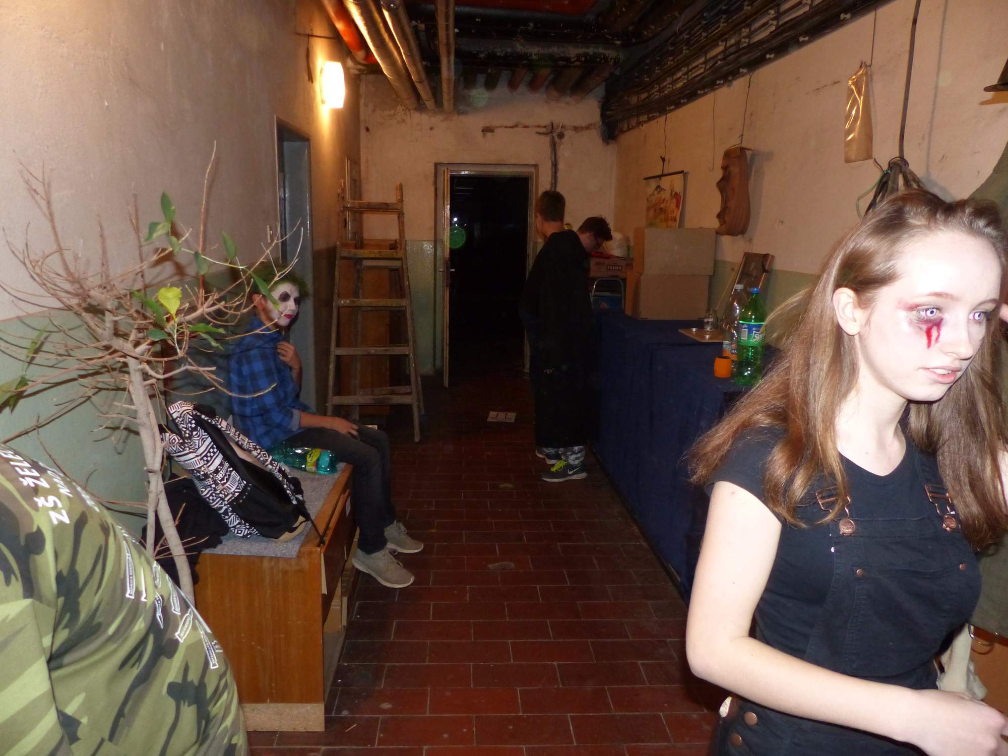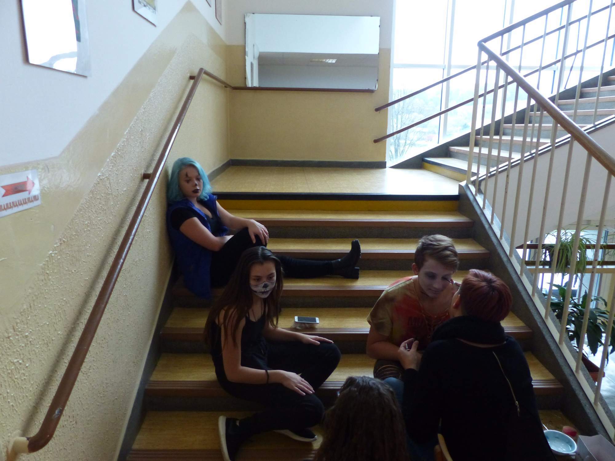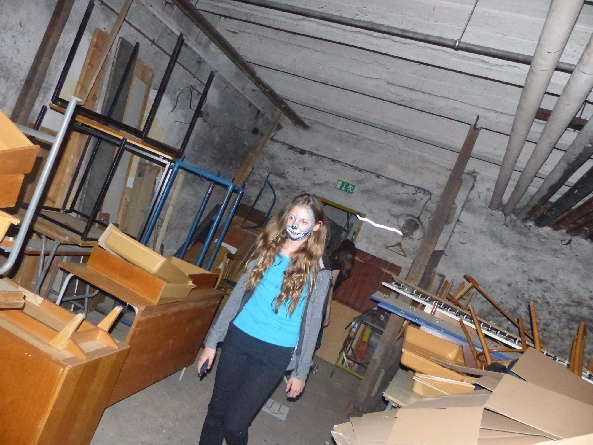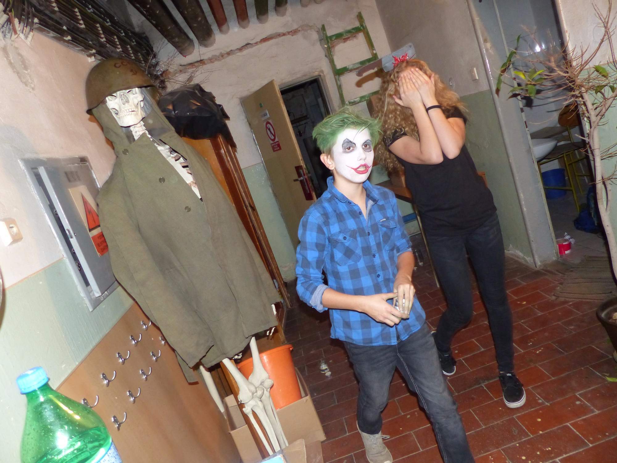 Všichni účastníci do puntíku splnili jedinou podmínku – museli přijít v maskách, takže už u vchodu jsme některé žáky nepoznávali. Po úvodním přivítání, kterého se chopila Gabča Vinklerová, propukla módní přehlídka moderovaná Soňou Krčkovou, v roli modelek upírky, strašilky a příšery ze 6.B. Kde, jak a proč se začal slavit Halloween otestoval kvíz, který připravili Dan Šácha a Ondra Špendlík. Pak jsme čekali na překvapení – ovšem nečekali jsme nehybně, neboť celá aula se roztančila ve stylu Just Dance a snažila se vlnit stejně tak, jako Róza Slováčková a Anička Novotná. A najednou – z ničeho nic se mezi námi ocitla zombie: mrtvolný pohled, rozdrásané tričko, nebezpečně pomalé pohyby… A už po nás šla – tedy šel. To bylo ono slibované překvapení, multiumělec Charles. Mohli jsme pak obdivovat až strašnou hru jeho svalů, které předvedl při tanci. Musíme uznat, že žáci, které si vybral ke spoluúčinkování, mu mnohdy směle konkurovali! A byl nejvyšší čas vydat se na stezku odvahy. Za pomoci pana školníka deváťáci pod vedením Davida Váni a asistence Dominika Kostky připravili hrůzostrašné nástrahy při průchodu školním sklepem. Nebudeme mnoho prozrazovat, ale svou roli sehrála i tarantule, pomůcky z přírodopisného kabinetu (kostlivec, „Anča“) a jiné děsivosti (v neposlední řadě sami deváťáci…). Na konci stezky byli odvážlivci odměněni perníčkem (samozřejmě halloweenským, třeba ve tvaru netopýra, napekla paní učitelka Hromadová s osmáky). Důkazem toho, kolik lidí stezku zvládlo, je podpisová listina – samozřejmě se každý podepsal přiloženou krví… A pak se pilo (Nápoj věčného mládí, Krev jednorožce, Elixír lásky), tančilo, strašilo, kecalo… No prostě party jak má být.