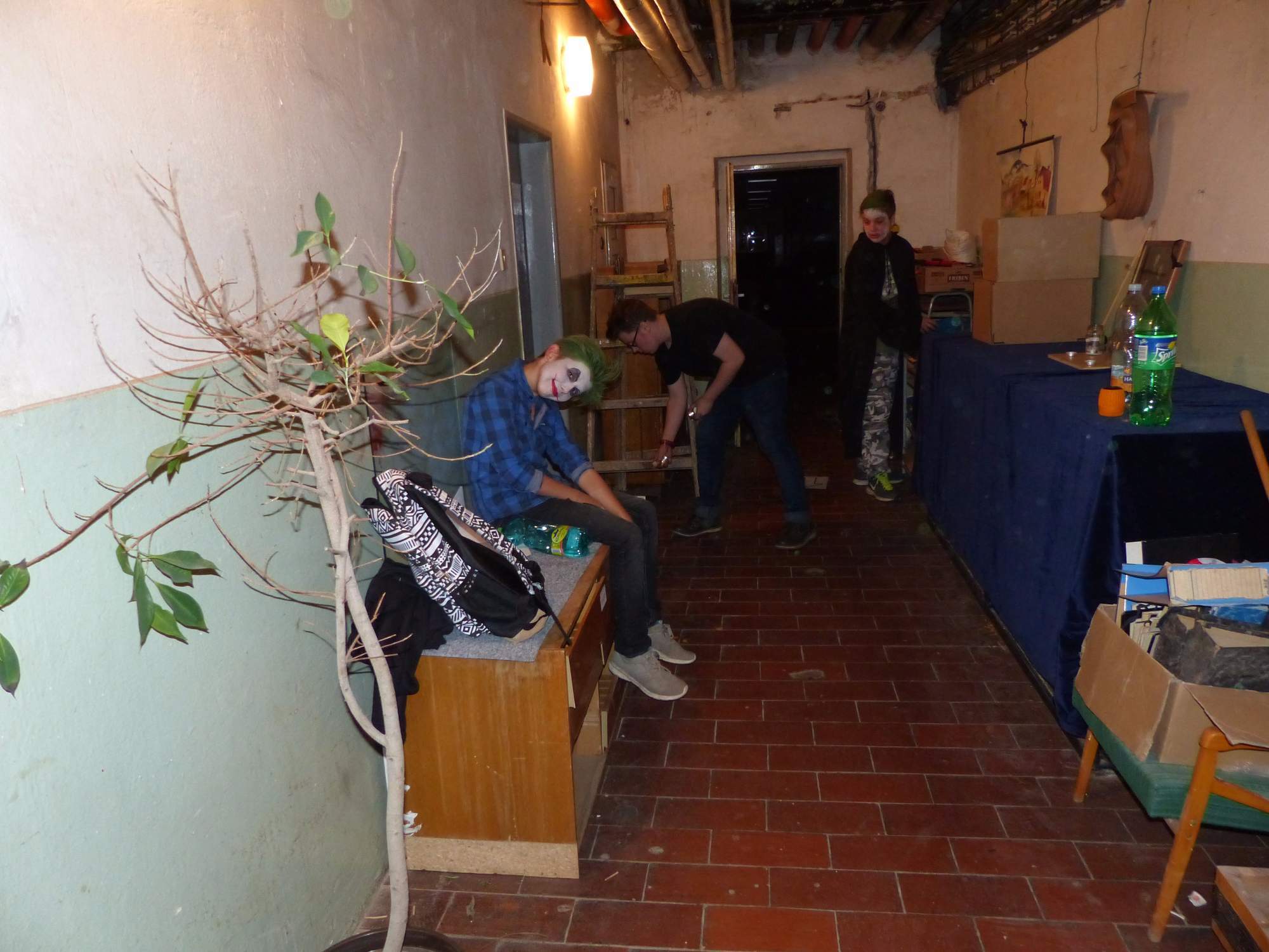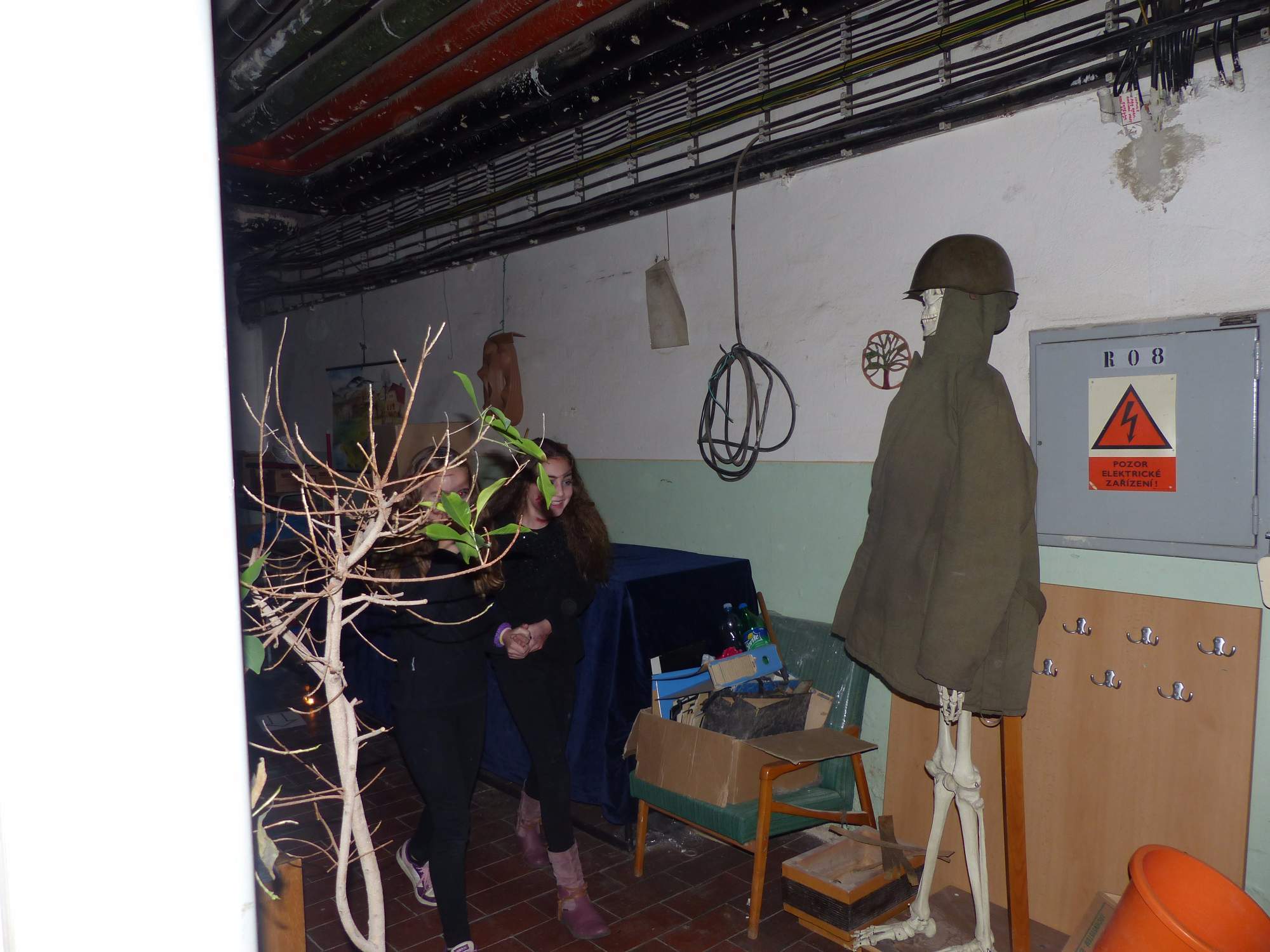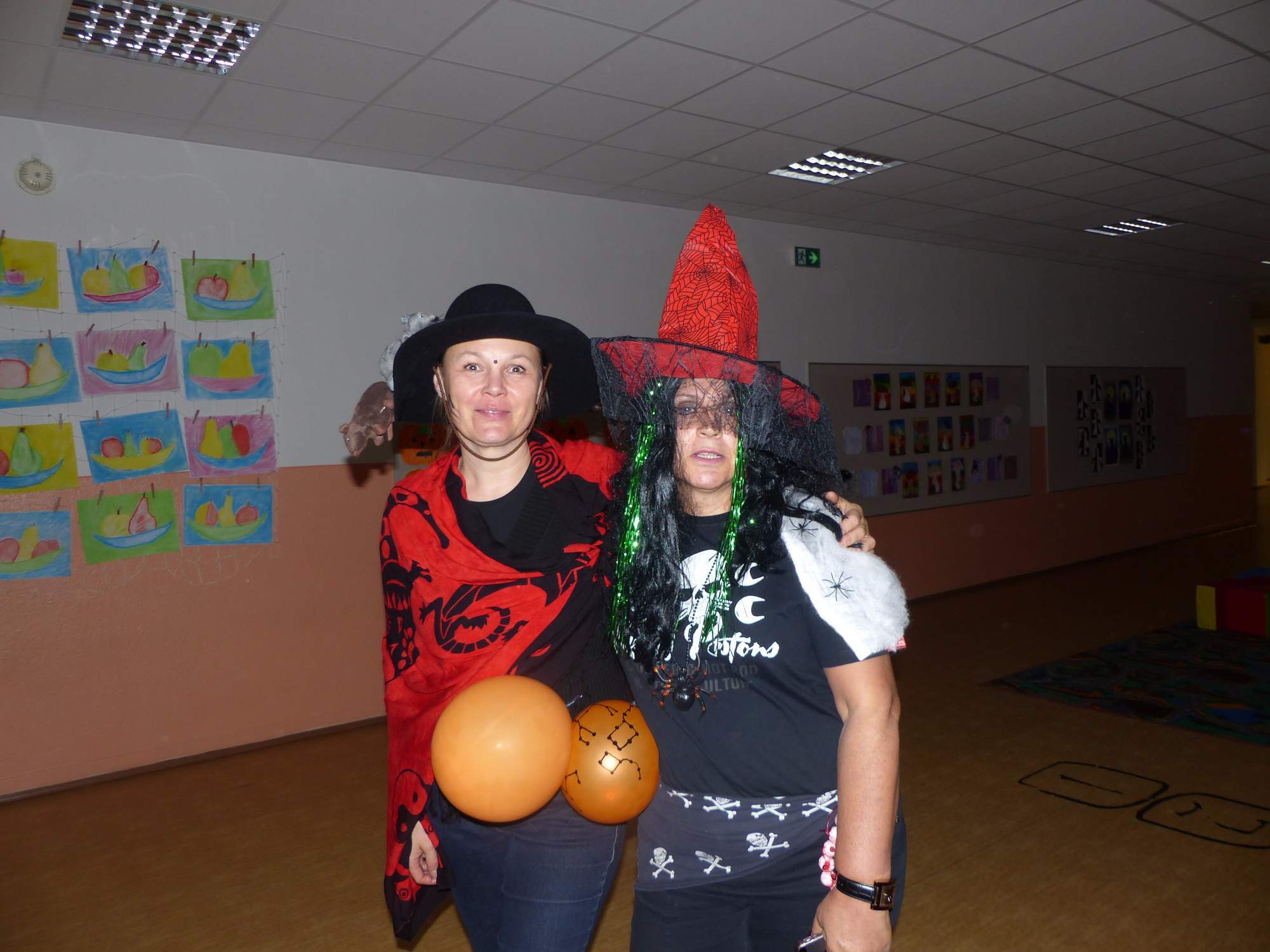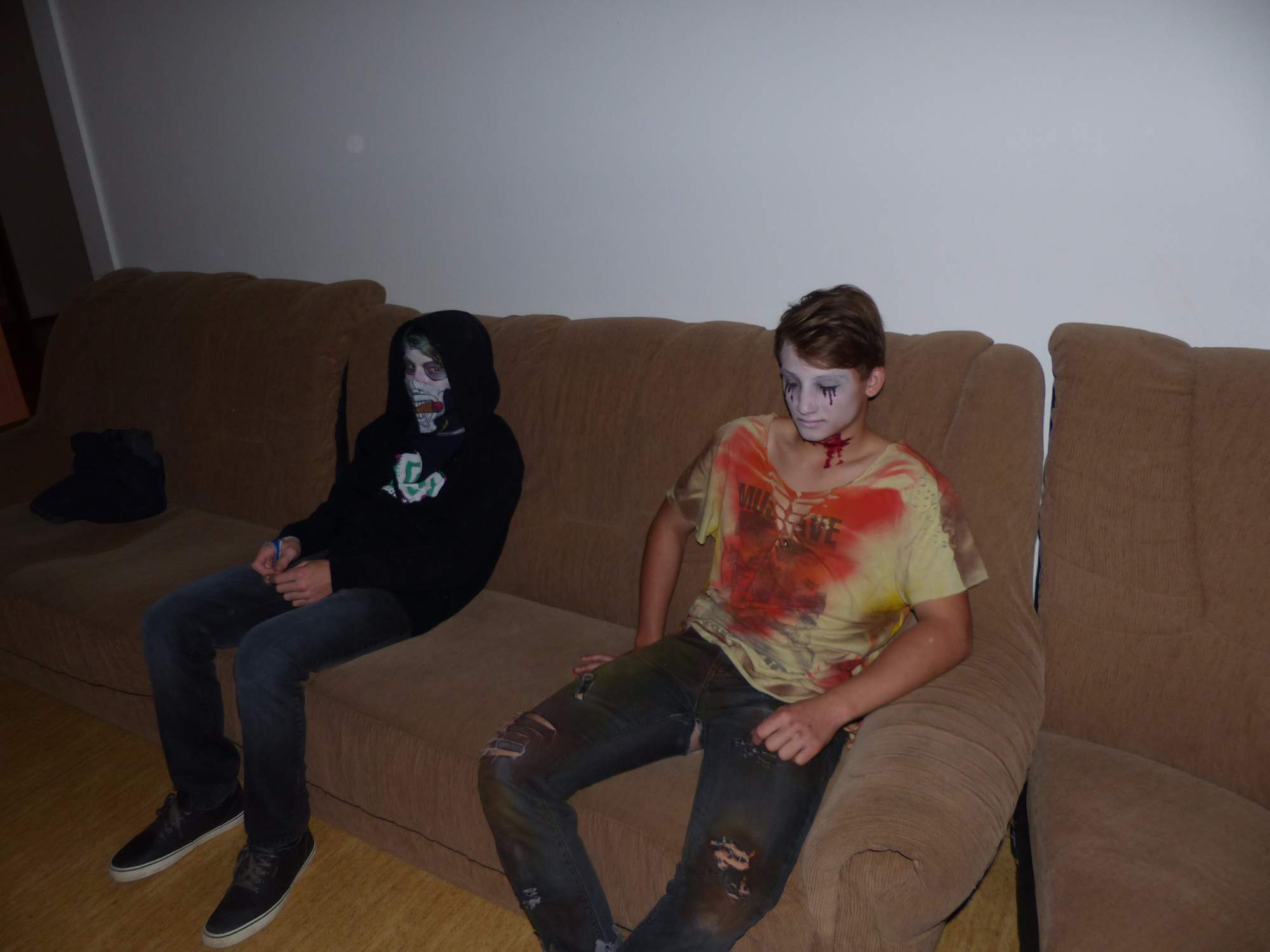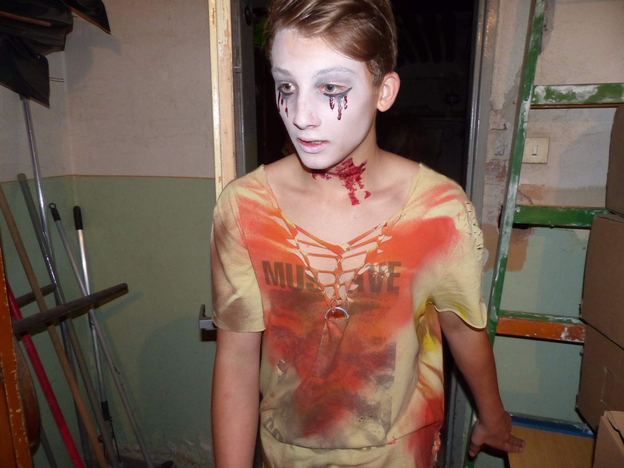 Všichni účastníci do puntíku splnili jedinou podmínku – museli přijít v maskách, takže už u vchodu jsme některé žáky nepoznávali. Po úvodním přivítání, kterého se chopila Gabča Vinklerová, propukla módní přehlídka moderovaná Soňou Krčkovou, v roli modelek upírky, strašilky a příšery ze 6.B. Kde, jak a proč se začal slavit Halloween otestoval kvíz, který připravili Dan Šácha a Ondra Špendlík. Pak jsme čekali na překvapení – ovšem nečekali jsme nehybně, neboť celá aula se roztančila ve stylu Just Dance a snažila se vlnit stejně tak, jako Róza Slováčková a Anička Novotná. A najednou – z ničeho nic se mezi námi ocitla zombie: mrtvolný pohled, rozdrásané tričko, nebezpečně pomalé pohyby… A už po nás šla – tedy šel. To bylo ono slibované překvapení, multiumělec Charles. Mohli jsme pak obdivovat až strašnou hru jeho svalů, které předvedl při tanci. Musíme uznat, že žáci, které si vybral ke spoluúčinkování, mu mnohdy směle konkurovali! A byl nejvyšší čas vydat se na stezku odvahy. Za pomoci pana školníka deváťáci pod vedením Davida Váni a asistence Dominika Kostky připravili hrůzostrašné nástrahy při průchodu školním sklepem. Nebudeme mnoho prozrazovat, ale svou roli sehrála i tarantule, pomůcky z přírodopisného kabinetu (kostlivec, „Anča“) a jiné děsivosti (v neposlední řadě sami deváťáci…). Na konci stezky byli odvážlivci odměněni perníčkem (samozřejmě halloweenským, třeba ve tvaru netopýra, napekla paní učitelka Hromadová s osmáky). Důkazem toho, kolik lidí stezku zvládlo, je podpisová listina – samozřejmě se každý podepsal přiloženou krví… A pak se pilo (Nápoj věčného mládí, Krev jednorožce, Elixír lásky), tančilo, strašilo, kecalo… No prostě party jak má být.